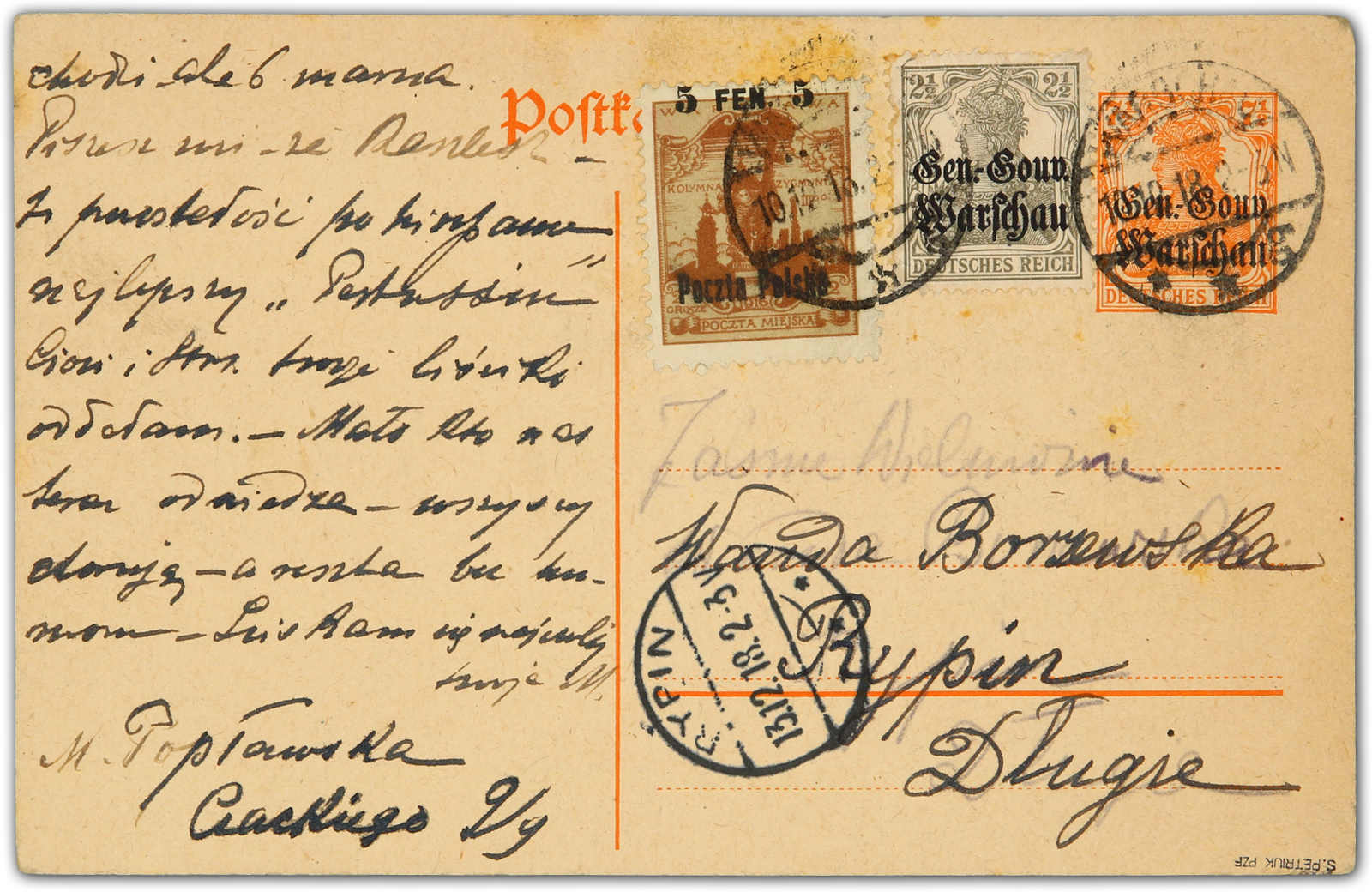 1918, 5 Fen. Aufdruckmarke auf 7½ Pfg.-Ganzsachenpostkarte mit zufrankierter 2½ Pfg.-Marke (Zahnfehler) des Generalgouvernements Warschau mit weiterverwendetem deutschen Stempel "WARSCHAU 10.12.18", sehr seltene, nur bis 15.12.1918
