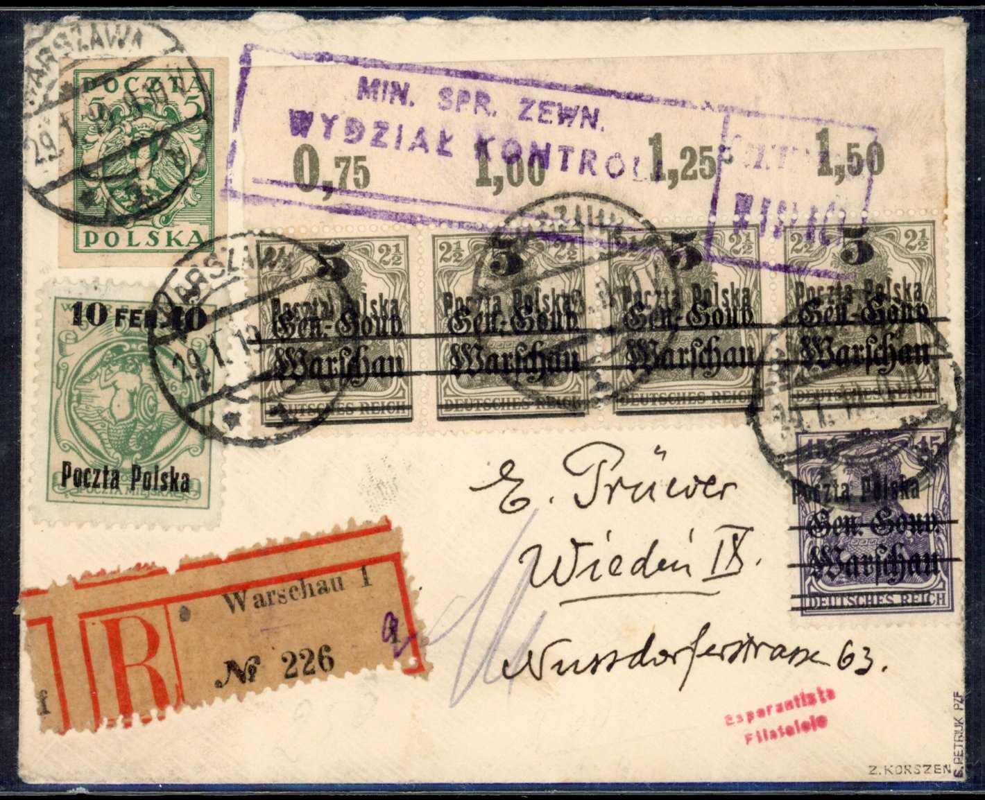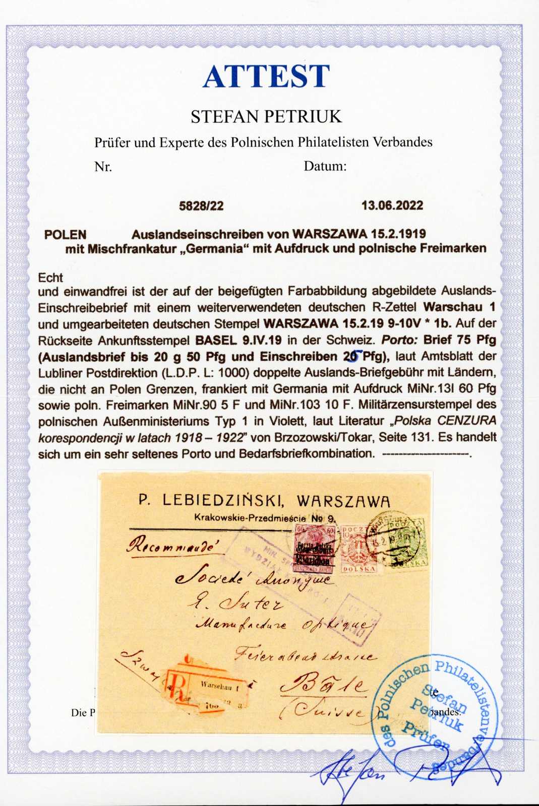 1919, 10 Fen. Aufdruckmarke mit Germania-Aufdruckwerten und Nordpolen 5 F. als Mischfrankatur auf R-Brief ab "WARSZAWA 29.1.19" nach Wien, deutscher R-Zettel, polnische Militärzensur des Außenministeriums, sign. Korszen und Petriuk (Image)
