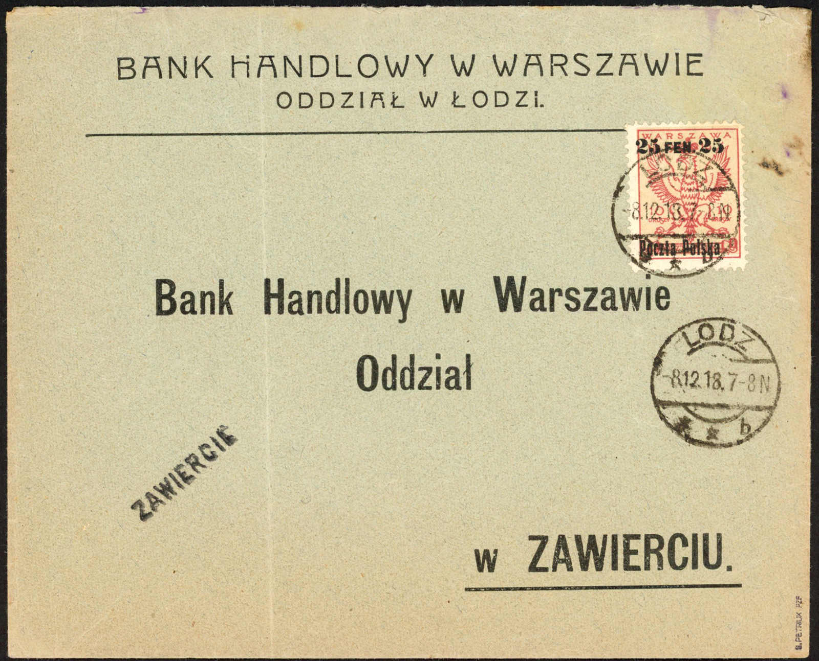 1918, 25 Fen. Aufdruckmarke als seltene Einzelfrankatur auf Brief nach Zawiercie (provisorischer Ankunftsstempel), weiterverwendeter deutscher Stempel "LODZ 8.12.18", Umschlag senkr. Faltung und etwas fleckig, sign. Petriuk (Image)