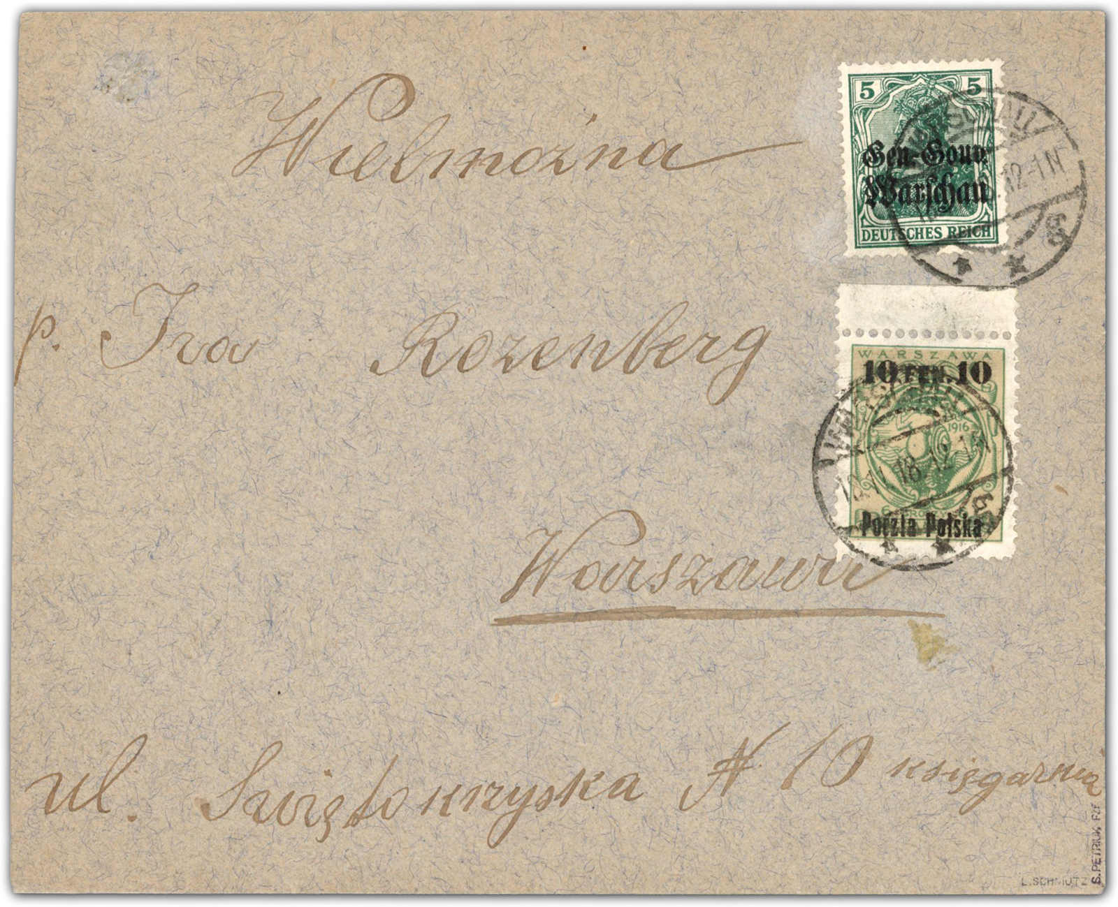 1918, 10 Fen. Aufdruckmarke mit 5 Pfg. Generalgouvernement Warschau ohne Aufdruck Poczta Polska (Verwendung nur bis 15.12.18 möglich) auf Ortsbrief, weiterverwendeter deutscher Stempel "WARSCHAU 18.11.18", sehr frühe Verwendung der