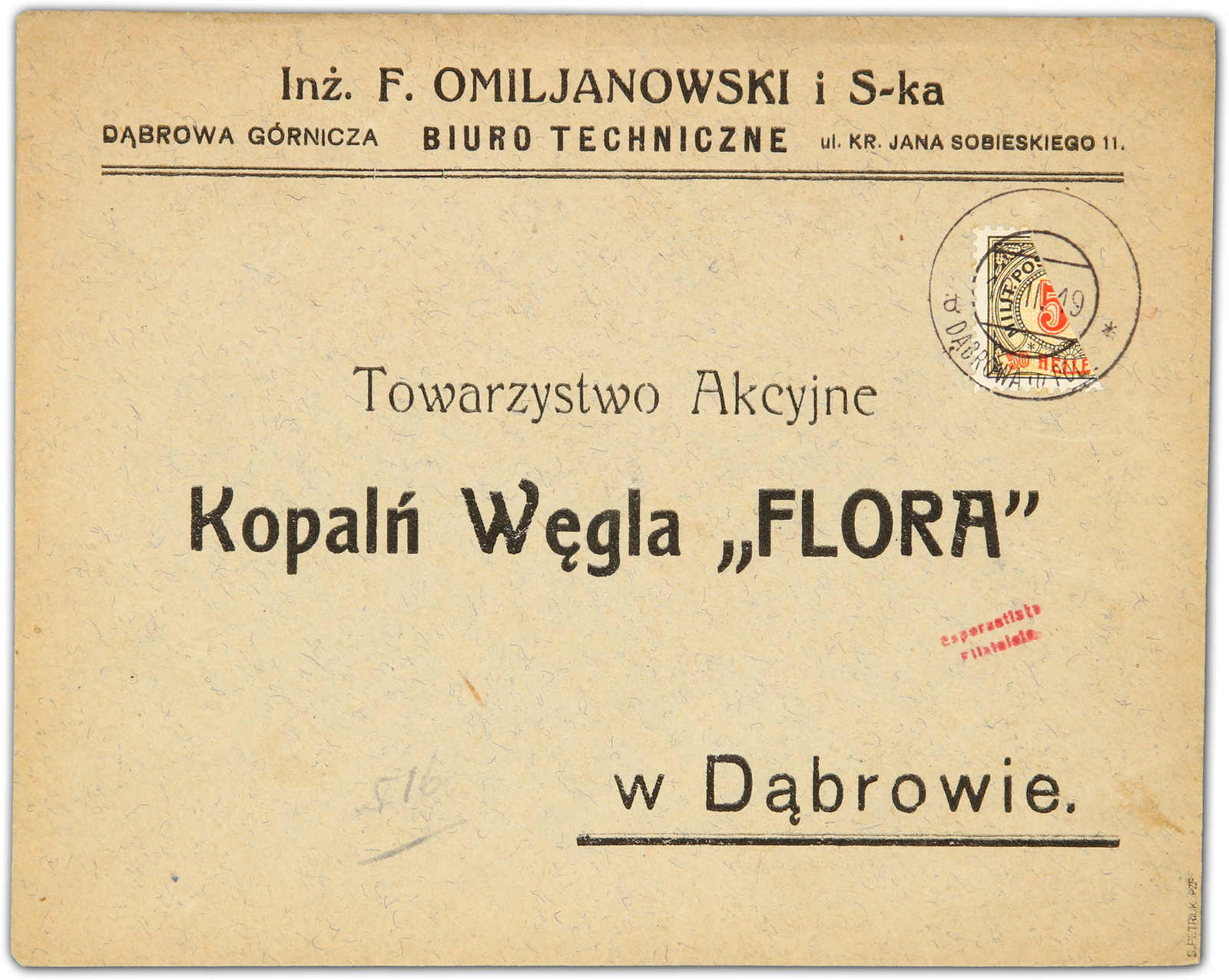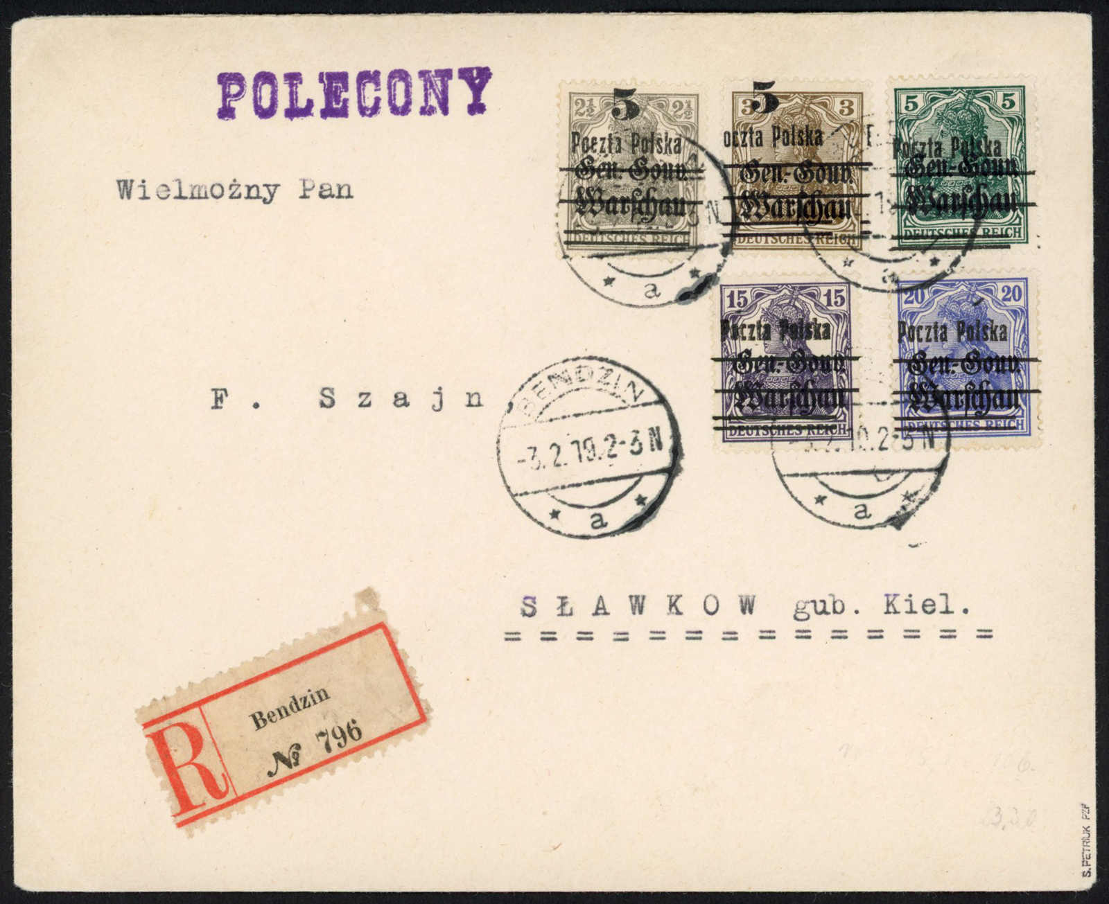 1919, 5 auf 2½, 5 auf 3, 5, 15 und 20 Pfg. Aufdruck Poczta Polska auf Gen.-Gouv. Warschau mit deutschem R-Zettel und weiterverwendetem deutschen Tagesstempel "BENDZIN 3.2.19" auf R-brief nach Slawkow, als Ankunftsstempel diente der