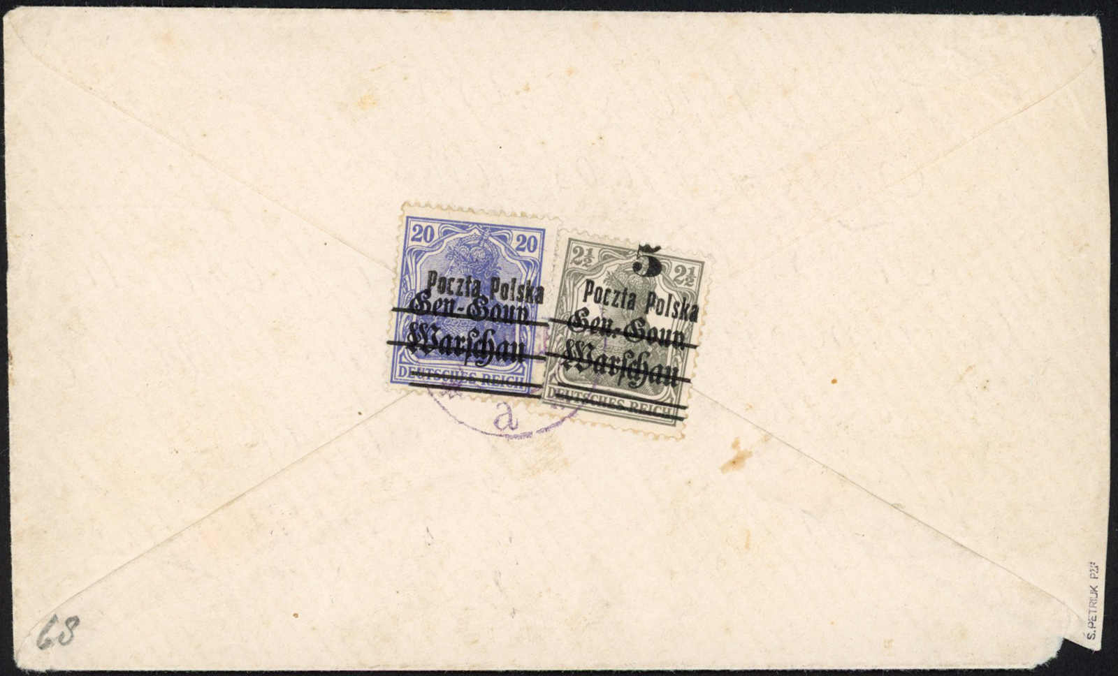 1919, 5 auf 2½ und 20 Pfg. Aufdruck Poczta Polska auf Gen.-Gouv. Warschau mit provisorischem Stempel "PACZEW" rückseitig auf Bedarfsbrief nach Russland an die Poststation Lisiczansk im Gouvernement Jekatarinen, Dorf Rubieznoje, poln.