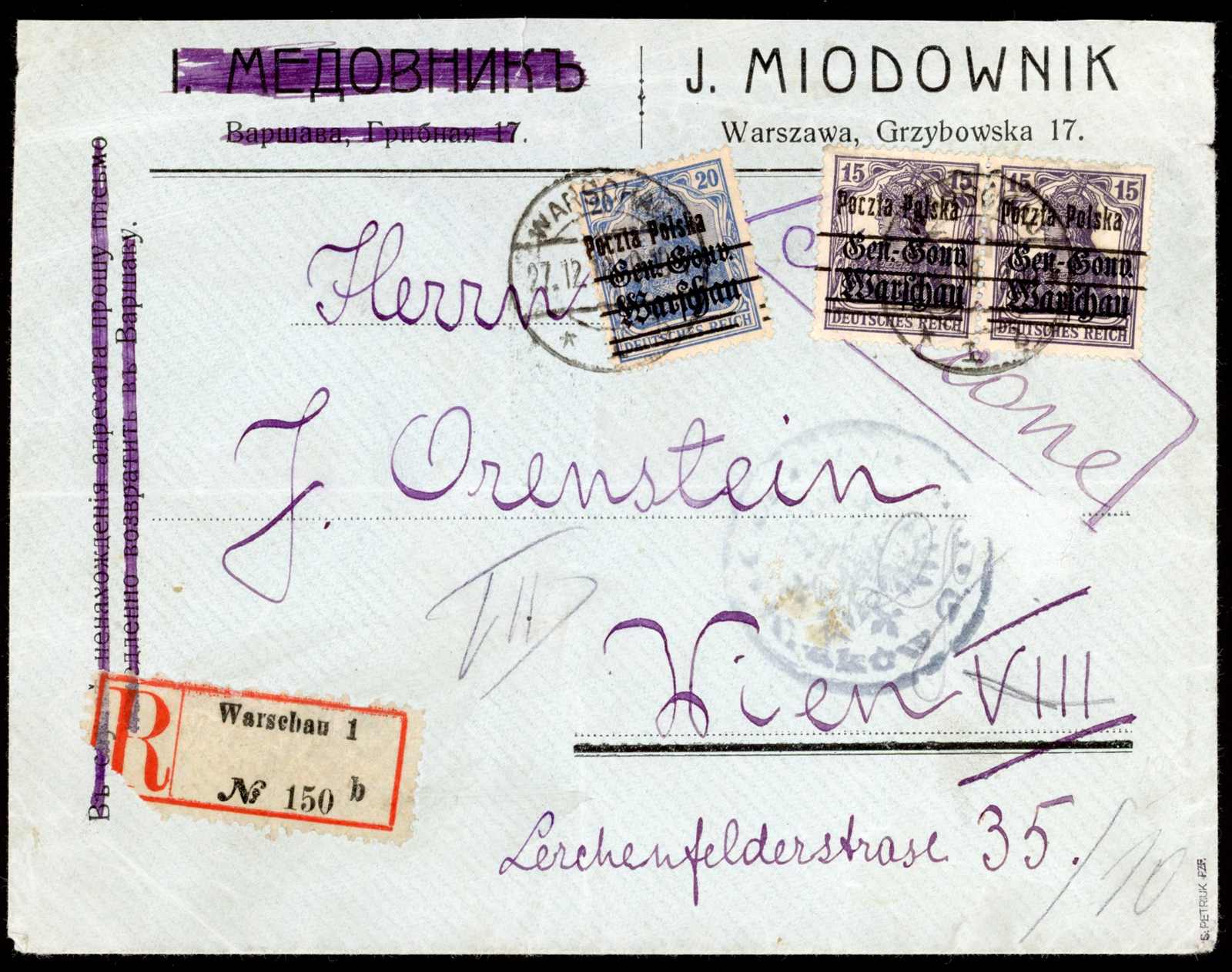 1918, 15 (2) und 20 Pfg. Aufdruck Poczta Polska auf Gen.-Gouv. Warschau mit weiterverwendetem deutschen R-Zettel und Tagesstempel "WARSCHAU 27.12.18" auf tarifgerechtem Einschreibbrief nach Wien, seltene Militärzensur Krakow vorderseitig