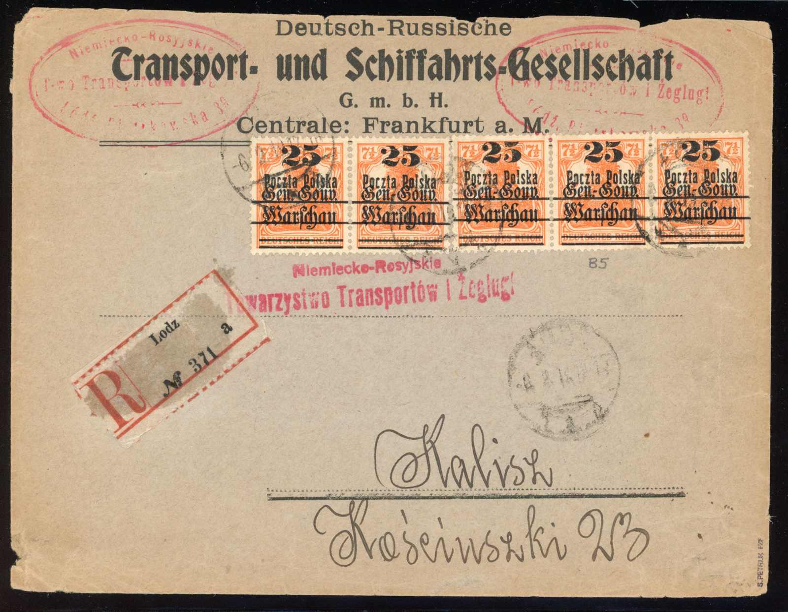 1919, 25 auf 7½ Pfg. Aufdruck Poczta Polska auf Gen.-Gouv. Warschau 5mal als sehr seltene tarifgerechte Mehrfachfrankatur mit weiterverwendetem deutschen R-Zettel und Tagesstempel "LODZ 6.2.19" auf Einschreibbrief der 2. Gewichtsstufe
