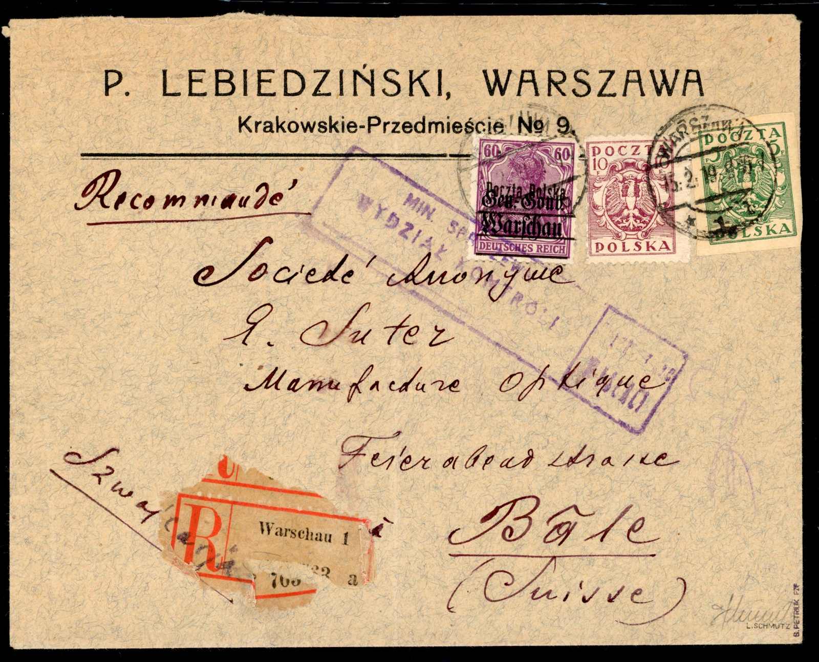 1918, 60 Pfg. Aufdruck Poczta Polska auf Gen.-Gouv. Warschau mit 5 und 10 F. polnischer Adler mit weiterverwendetem deutschen R-Zettel und umgearbeitetem Tagesstempel "WARSZAWA 15.2.19" auf Auslands-Einschreibbrief in die Schweiz, Porto