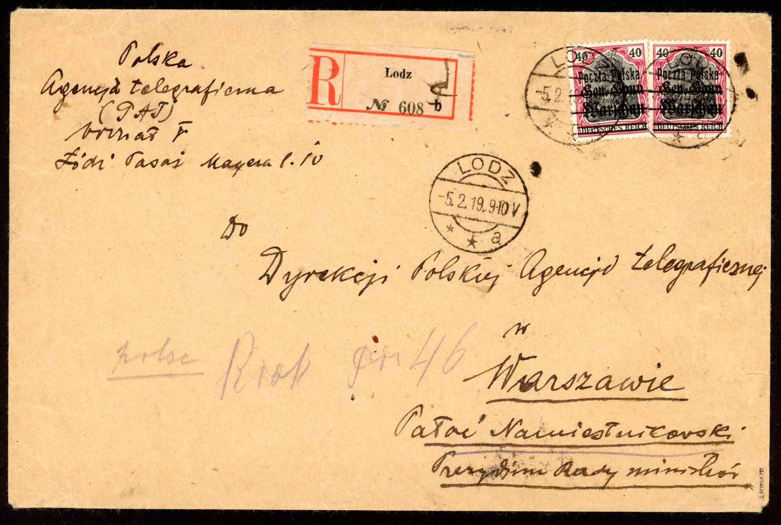 1919, 40 Pfg. Aufdruck Poczta Polska auf Gen.-Gouv. Warschau 2mal auf tarifgerechtem R-Brief mit deutschem R-Zettel und Tagesstempel "LODZ 5.2.19" an die polnische Telegraphenagentur beim Präsidium des Ministerrates in Warschau,