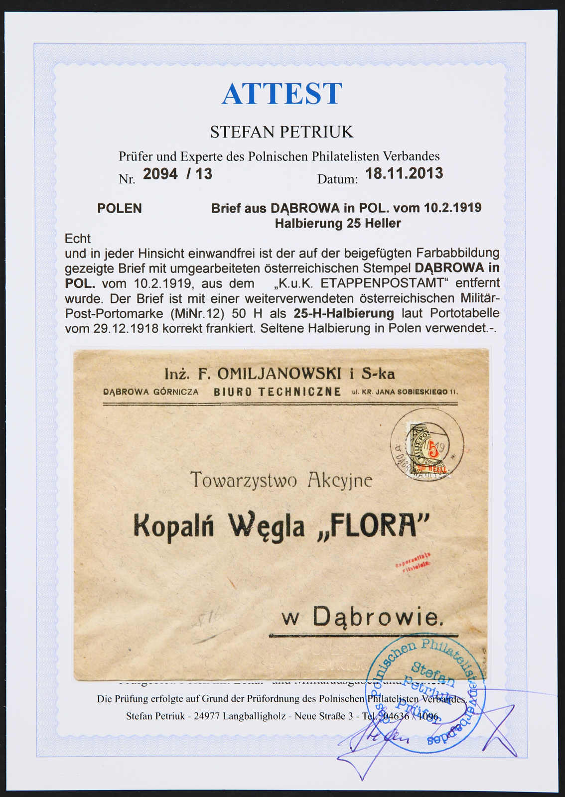 1919, 50 H. Portomarke von Bosnien Herzogowina, halbiert als portogerechte Frankatur von 25 H. auf Ortsbrief, aufgegeben "DABROWA" in Polen nach dem eigentlichen Verbot der österr. Marken aufgegebraucht, einwandfrei, selten, Fotoattest