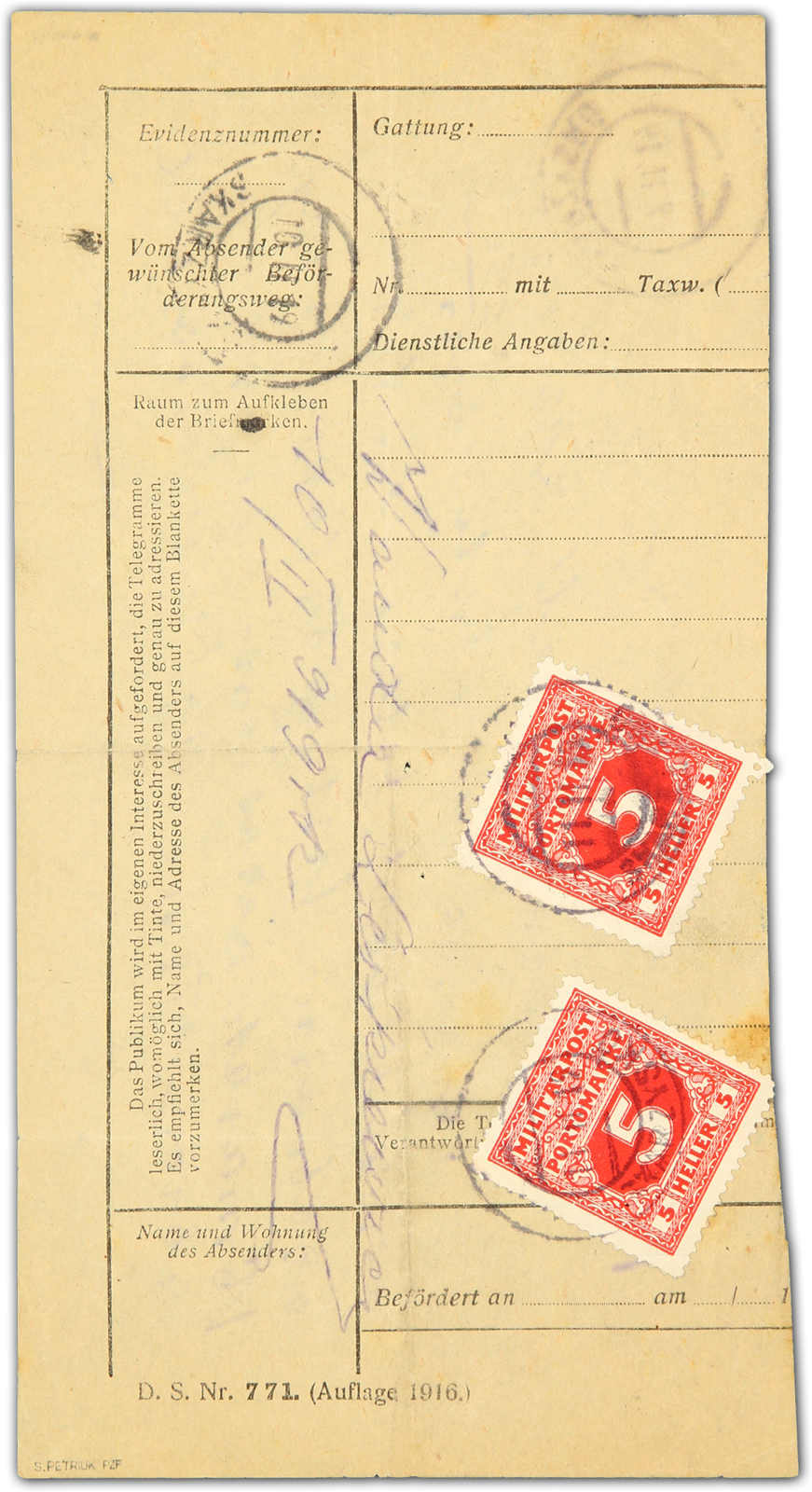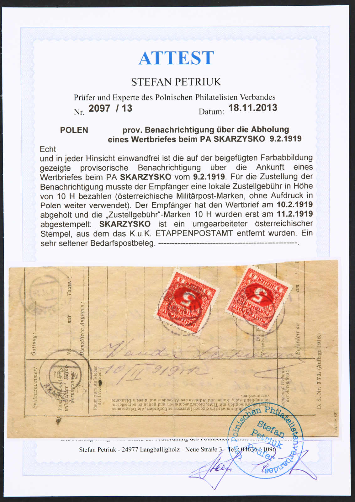 1919, 5 H. Portomarke von Bosnien-Herzogowina, 2 Einzelwerte als portogerechte Frankatur von 10 H. für die Benachrichtigung über die Ankunft eines Wertbriefes, aufgegeben "SKARZYSKO", eis seltenes Formular, einwandfrei, selten Fotoattest