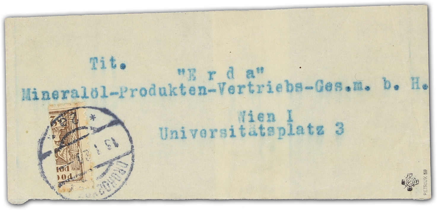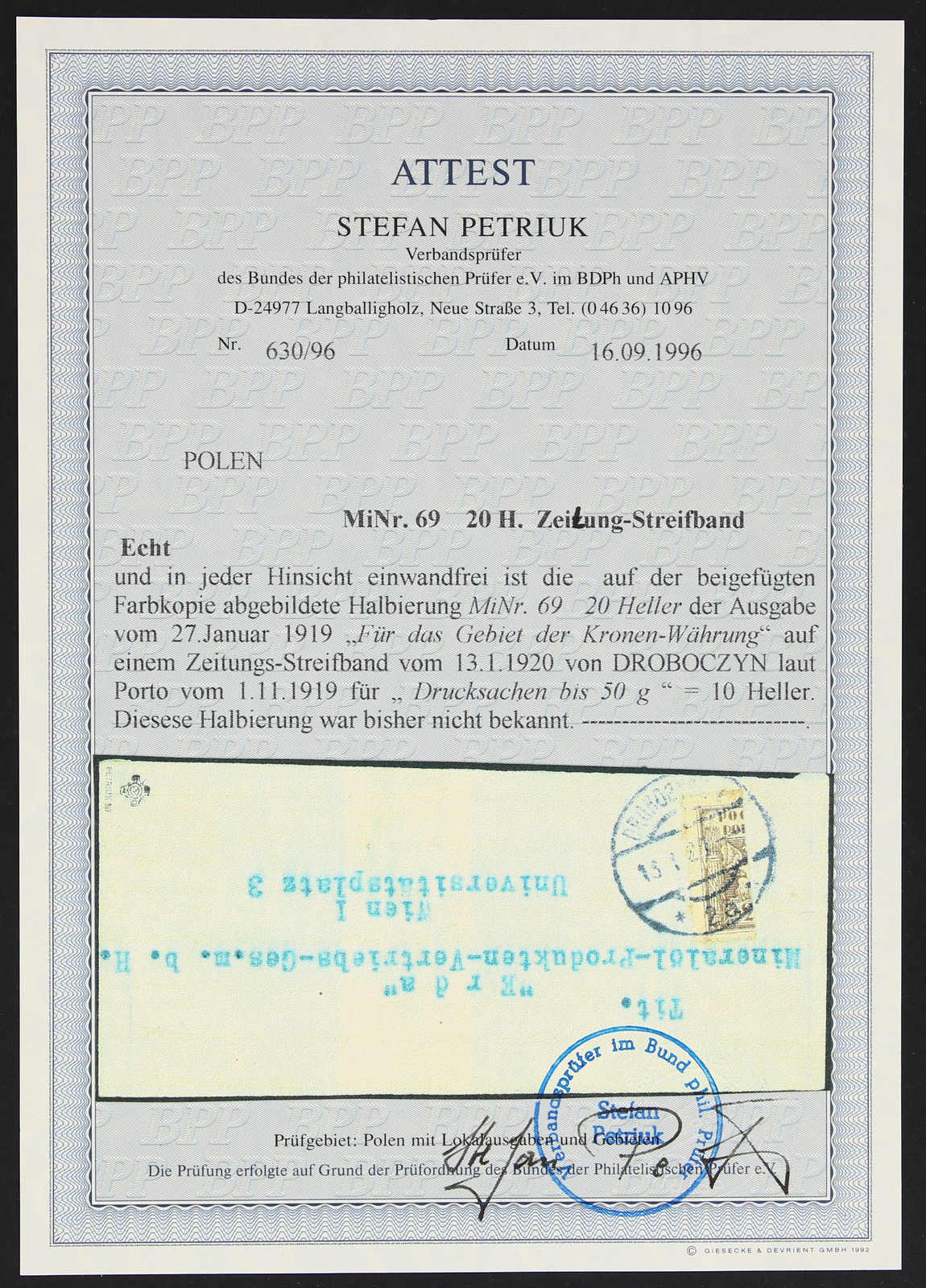 1919, 20 H. Poln. Adler graubraun als senkr. Halbierung auf portogerecht frankiertem Zeitungs-Streifband, aufgegeben "DROBOCZYN 13.1.19", adressiert an die Vertriebsgesellschaft für Mineralöl-Produkte in Wien, farbfrisch mit leichter