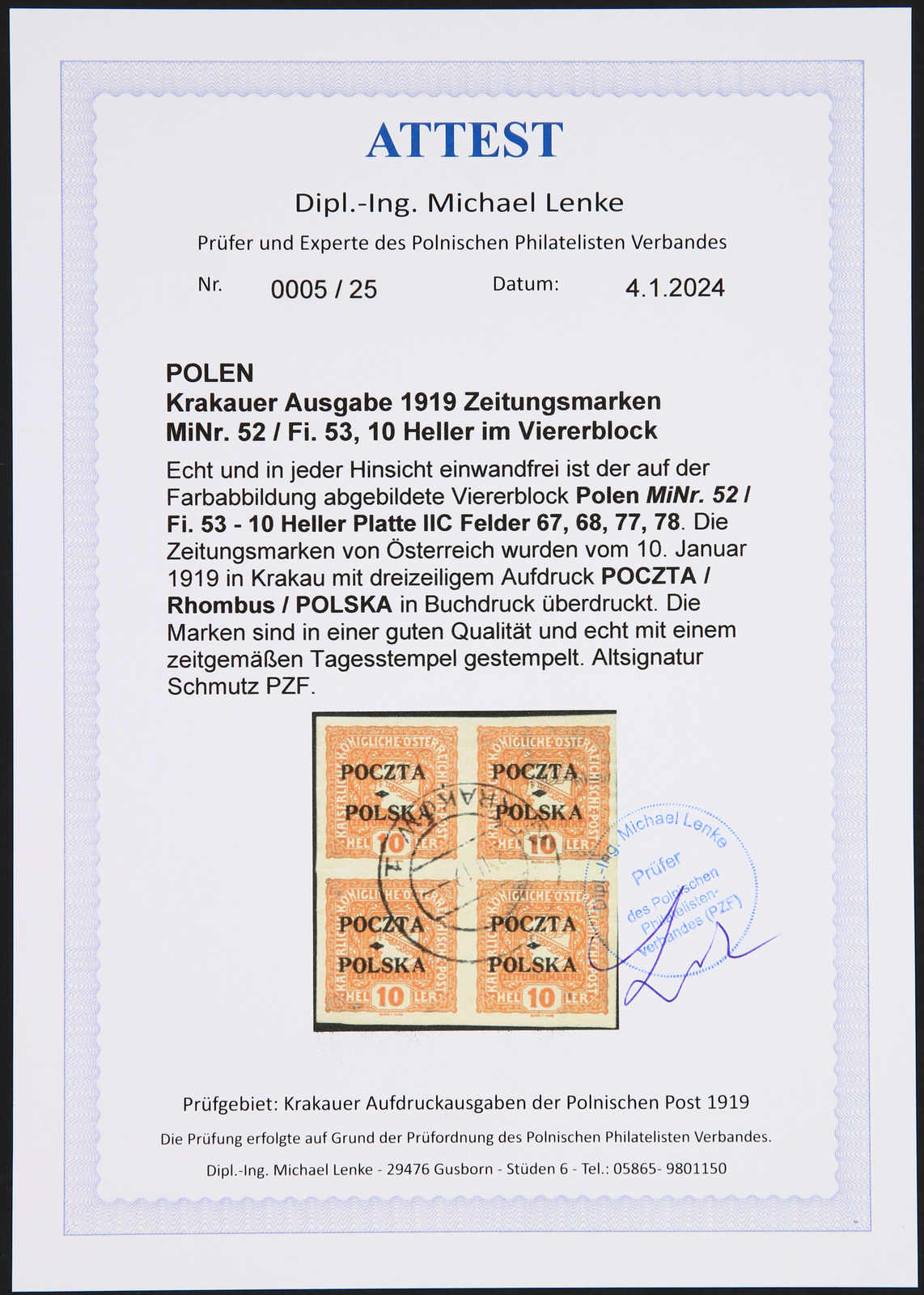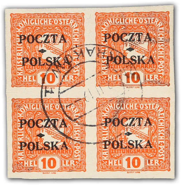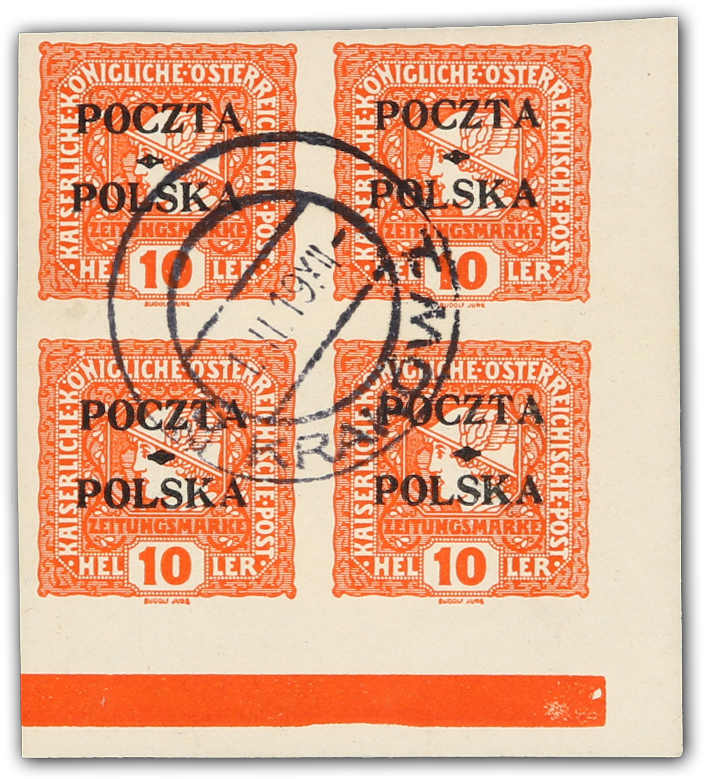 1919, 10 Heller Zeitungsmarke Krakauer Ausgabe, Viererblock mit einem zeitgemäßen Tagesstempel entwertet, Position 67, 68, 77, 78, einwandfrei, signiert, Fotoattest Lenke PZF (Fischer 3.200 Zl.) (Image) (imagea)