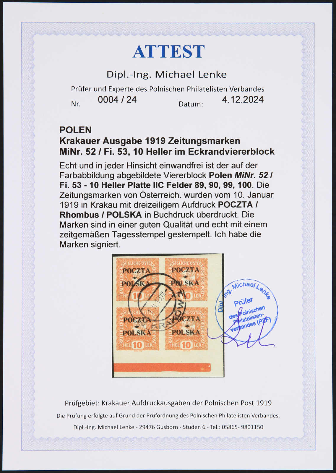 1919, 10 Heller Zeitungsmarke Krakauer Ausgabe orange, Eckrandviererblock mit einem zeitgemäßen Tagesstempel entwertet, einwandfrei, Position 89, 90, 99, 100, Fotoattest Lenke PZF (Fischer 3.200 Zl.) (Image) (imagea)