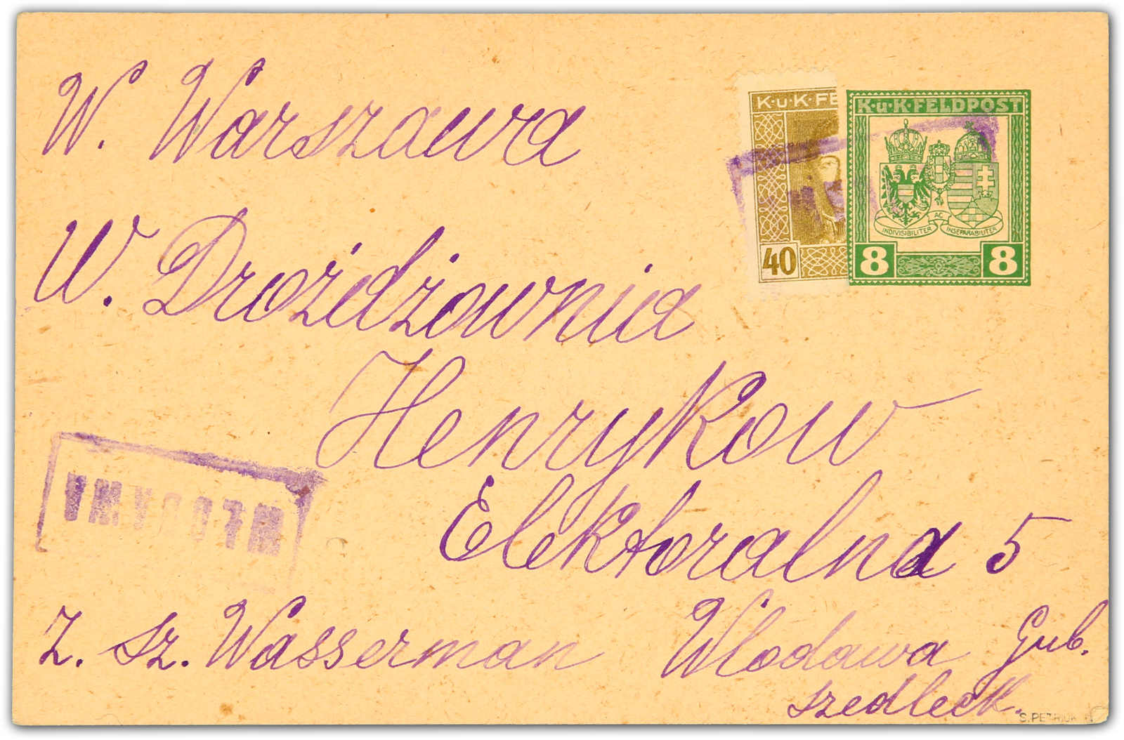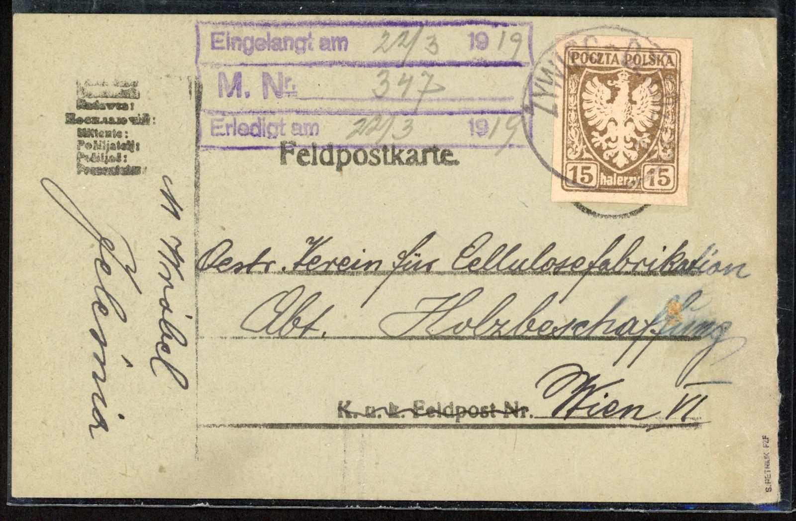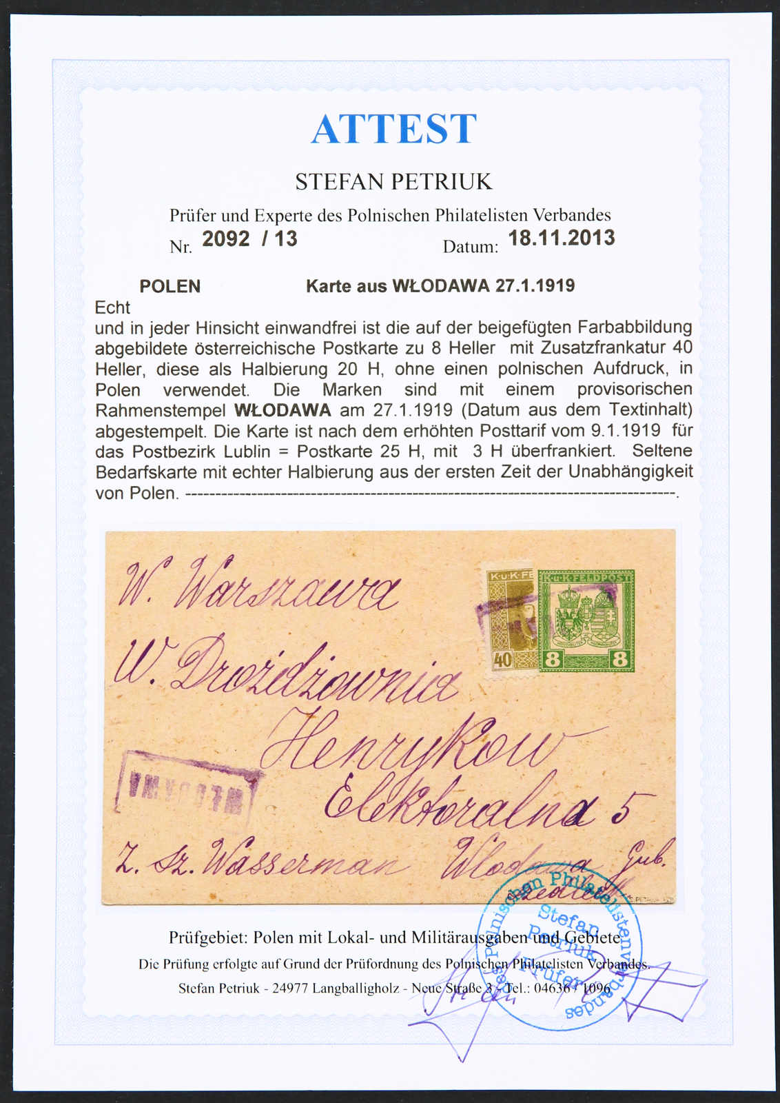 1919, 8 H. Ganzsachenkarte der österr. Feldpost mit Zusatzfrankatur einer halbierten 40 H. Kaiser Karl I. ohne poln. Aufdruck in Polen verwendet, aufgegeben "WLODAWA" (Rahmenstp.ohne Datumsangabe), rückseitig mit Bedafstext, einwandfrei,