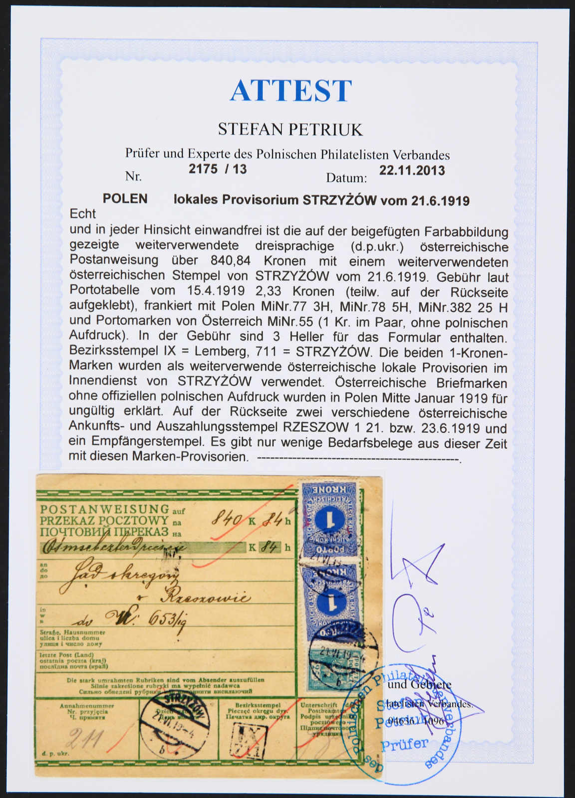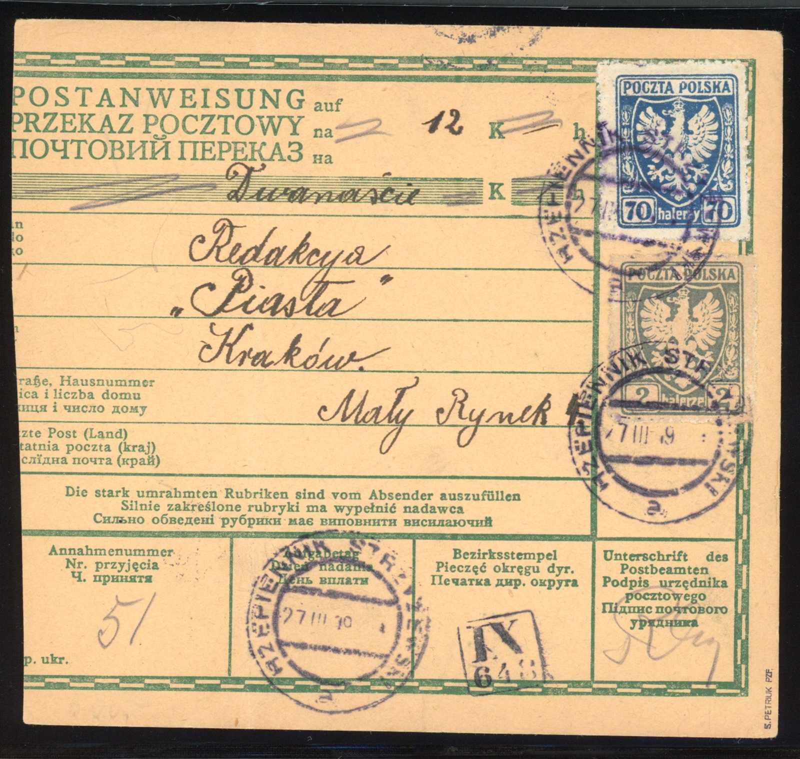 1919, 2 H. Freimarke für Galizien als Gebühr für den dreisprachigen Vordruck und 70 H. gleiche Ausgabe als Gebühr für die Postanweisung von 12 Kronen ab "RZEPIENNIK STRZYZEWSKI 7 III 19", beide Marken mit philatelistisch anerkannter