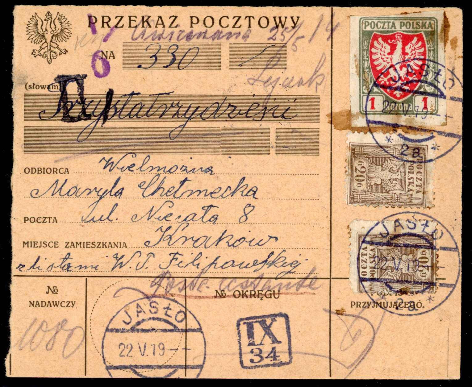 1919, 1 Kr. Freimarke für Galizien (selten) mit 2mal 20 H. poln. Adler auf Postanweisung ab "JASLO 22 V.19", rückseitig 50 H. mit lokalem Nachporto-Aufdruck Type 61 von Krakow für die Zustellung, sign. Petriuk (Image)