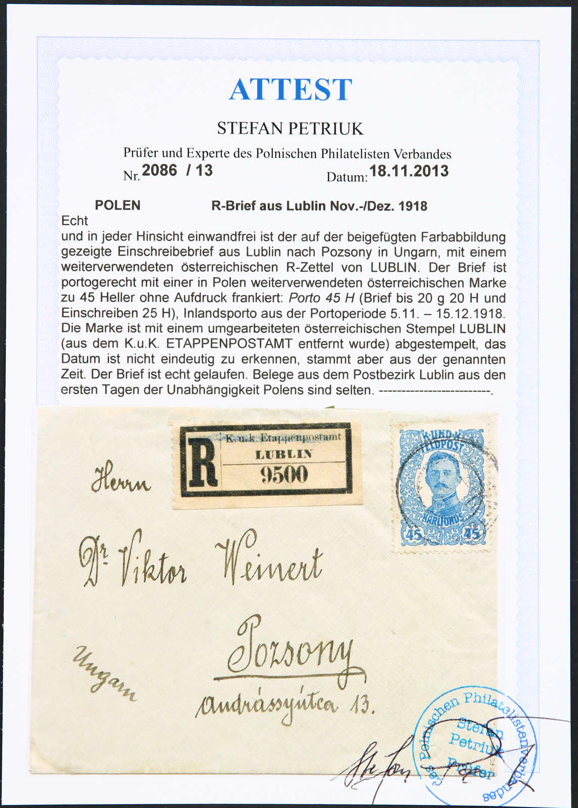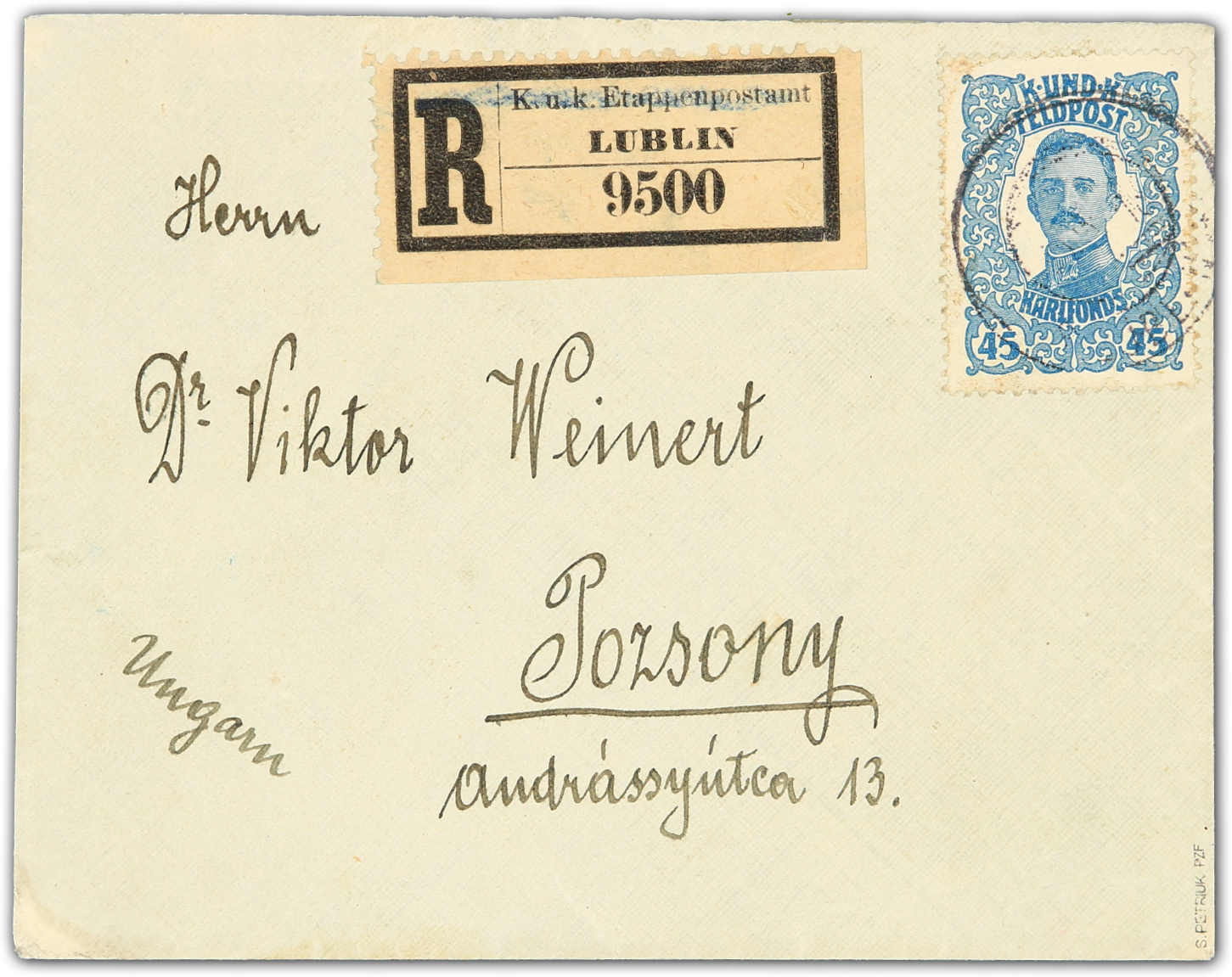 1918, 45 H. Kaiser Karl I. blau als portogerechte Einzelfrankatur ohne Aufdruck, auf Einschreibbrief, aufgegeben "K.u.K. ETAPPENPOSTAMT LUBLIN", adressiert nach Pozsony/Ungarn, vorderseitig mit weiterverwendetem R-Zettel des
