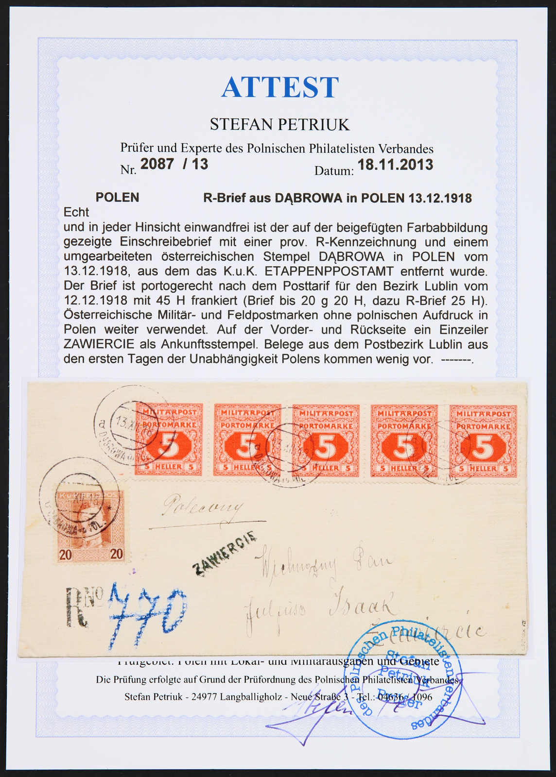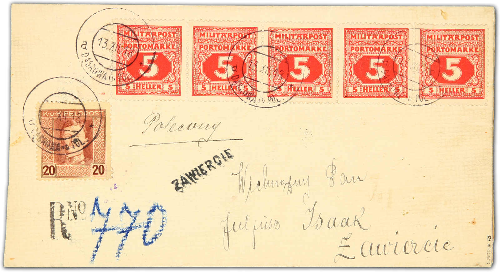 1918, 20 H. Kaiser Karl I. in Mischfrankatur mit 5 H. Portomarke von Bosnien/Herzogowina im waager. 5er-Streifen auf Einschreibbrief, aufgegeben "DABROWA", adressiert nach Zawiercie, vorderseitig schwarzer L1 als Ankunftsstp., seltene