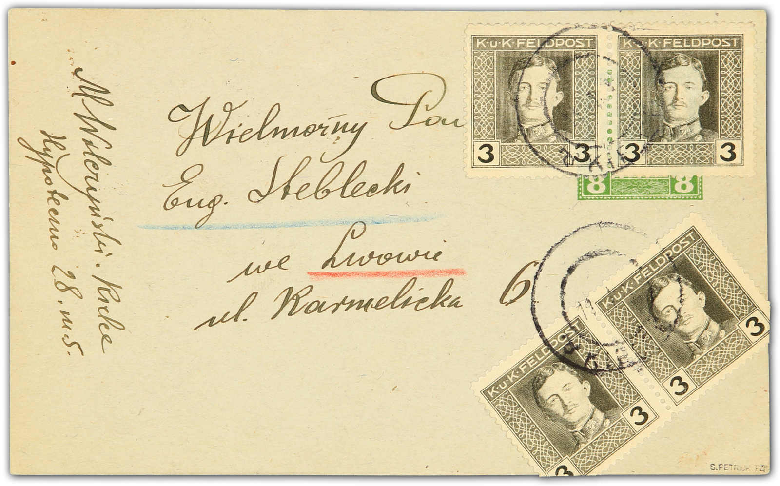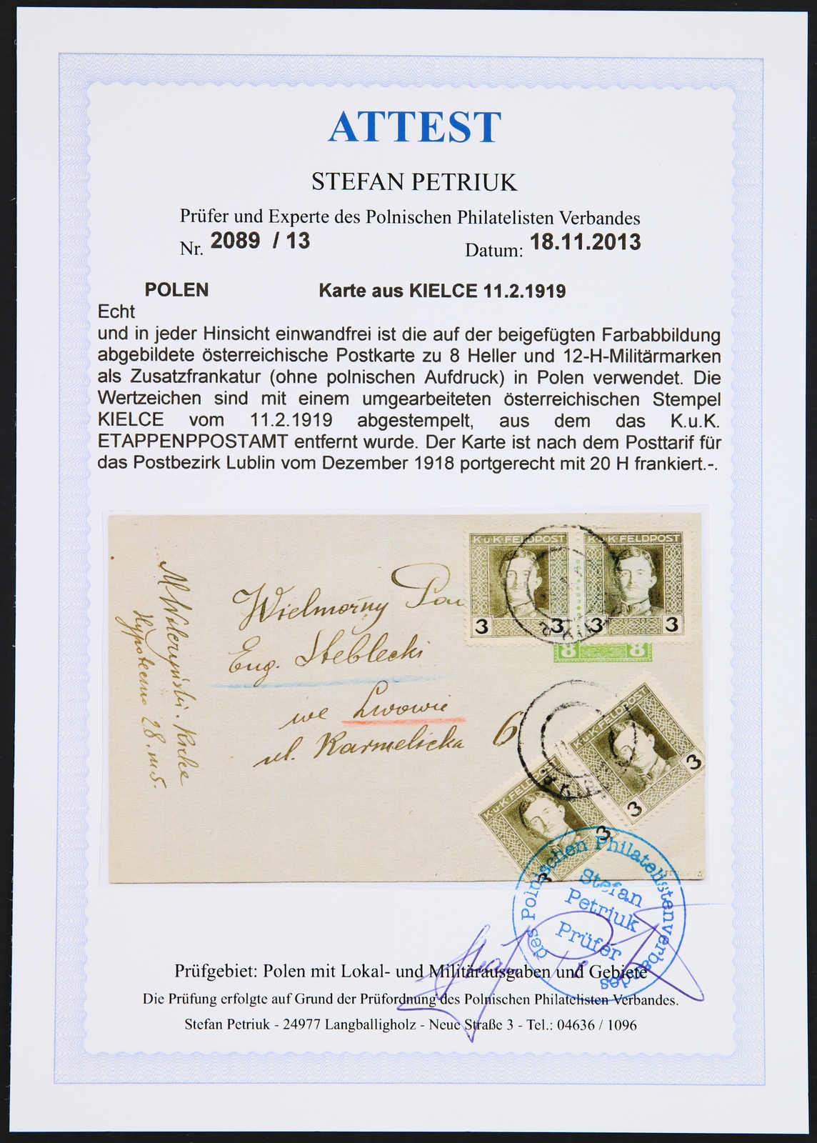 1919, 3 H. Kaiser Karl I., 4 Werte als Zusatzfrankatur auf 8 H. Ganzsachenkarte der Österr. Feldpost, aufgegeben "KIELCE", adressiert nach Lwow (Lemberg), mit rückseitigem Bedarfstext, 2 Marken mit um den Rand geklebter Ecke, einwandfrei,