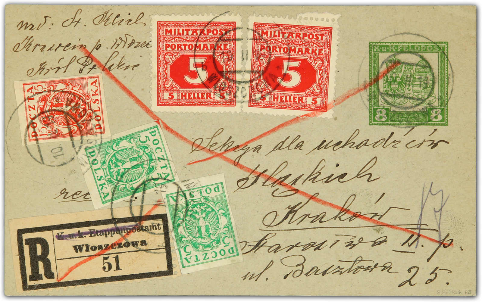 1919, 5 H. Portomarke von Bosnien Herzogowina, 2 Einzelwerte als Zusatzfr. mit 5 und 15 H. Polen auf 8 H. Ganzsachenkarte der österr. Feldpost, als Einschreibkarte, aufgegeben "WLOSZCZOWA10.2.1919", adressiert nach Krakow, rückseitig mit