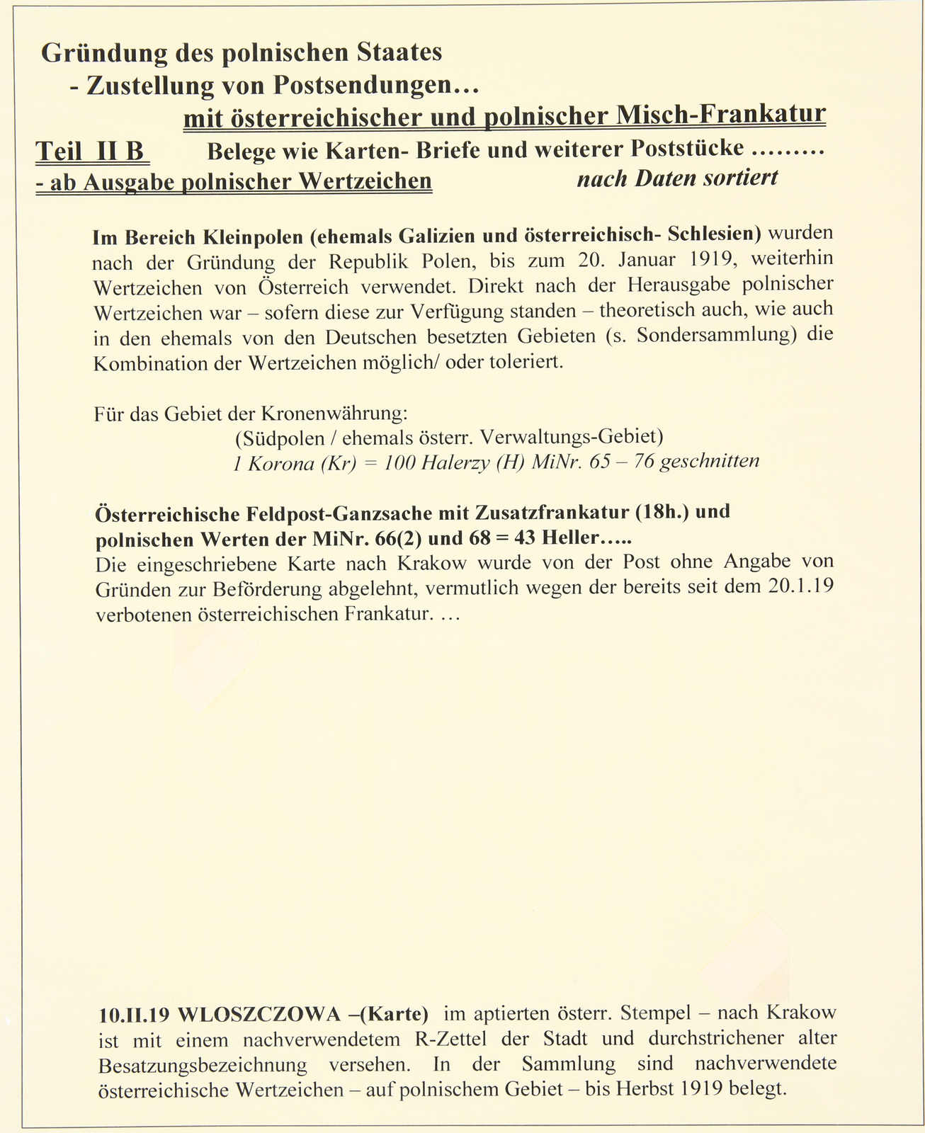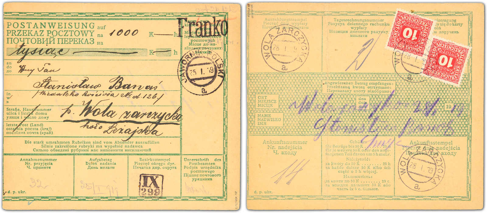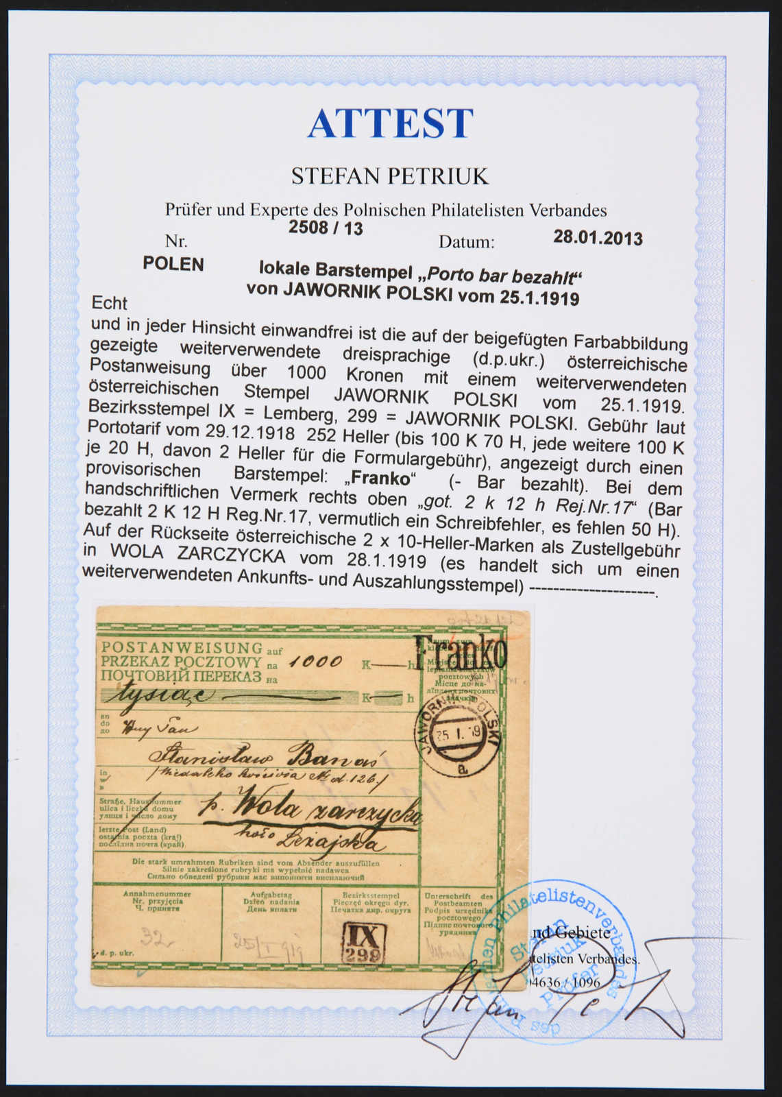 1919, Postanweisung über 1.000 Kr. als Barzahlung mit schwarzem L1 "Franko" und handschrftl. Gebühr 2 Kr. 12 h. frankiert, aufgegeben "JAWORNIK POLSKI 25.1.1919", adressiert nach Wola Zarczycka, rückseitig 2 Einzelwerte der 10 H.