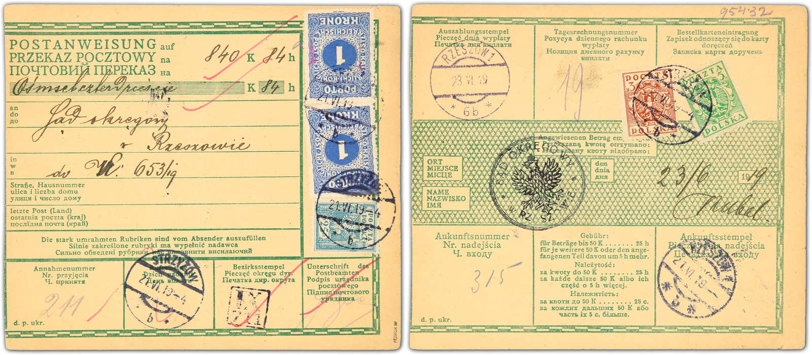 1919, 1 Kr. Portomarke dunkelgraublau zwei Einzelwerte in Mischfr. mit 3, 5 und 25 H. Poln. Adler auf Postanweisung über 840 Kr., aufgegeben "STRZYZOW 21.6.1919", adressiert nach Rzeszow, rückseitig mit Ankunftsstp., seltene