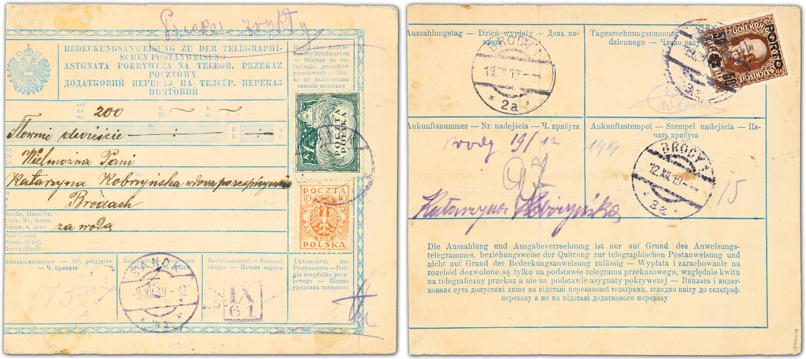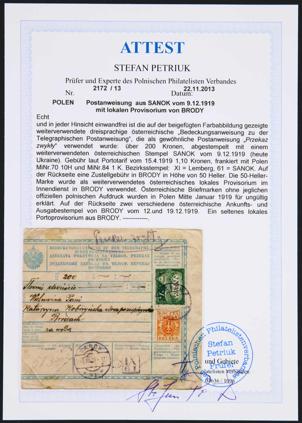 1919, 10 H. poln. Adler und 1 Kr. Getreidespeicher als portogerechte Frankatur auf Postanweisung über 200 Kr., aufgegeben "SANOK 9.12.1919", adressiert nach Brody, rückseitige Zustellgebühr in Höhe von 50 H. mit einer Portomarke