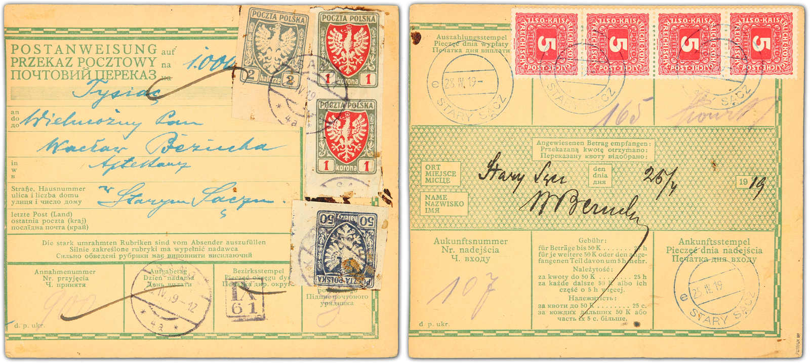 1919, 2 und 50 H. sowie 1 Kr. Adler in Mischfr. mit senkr. 4er-Streifen der österr. Portomarke zu 5 H. dunkelrosa, als portogerechte Frankatur auf einer Postanweisung über 1.000 Kr., aufgegeben "SANOK 23.4.1919", adressiert nach Stary