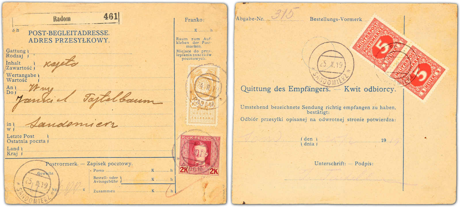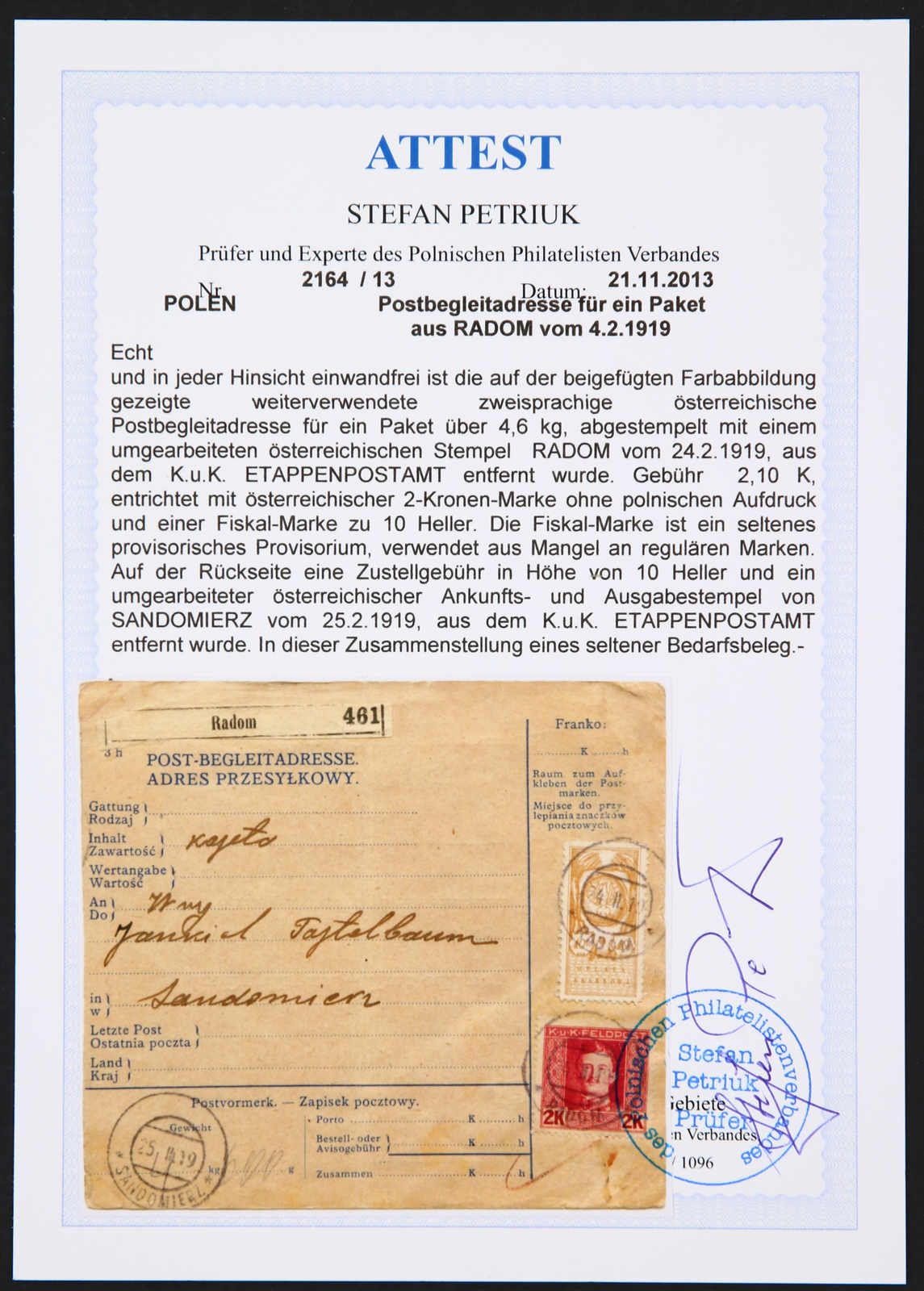 1919, 2 Kr. Kaiser Karl I. in Mischfr. mit 10 H. Fiskalmarke und senkr. Paar der österr. Portomarke zu 5 H. dunkelrosa (ein Wert Bug und fehlender Zahn) als portogerechte Frankatur auf einer Paketkarte, aufgegeben "RADOM 24.2.1919",