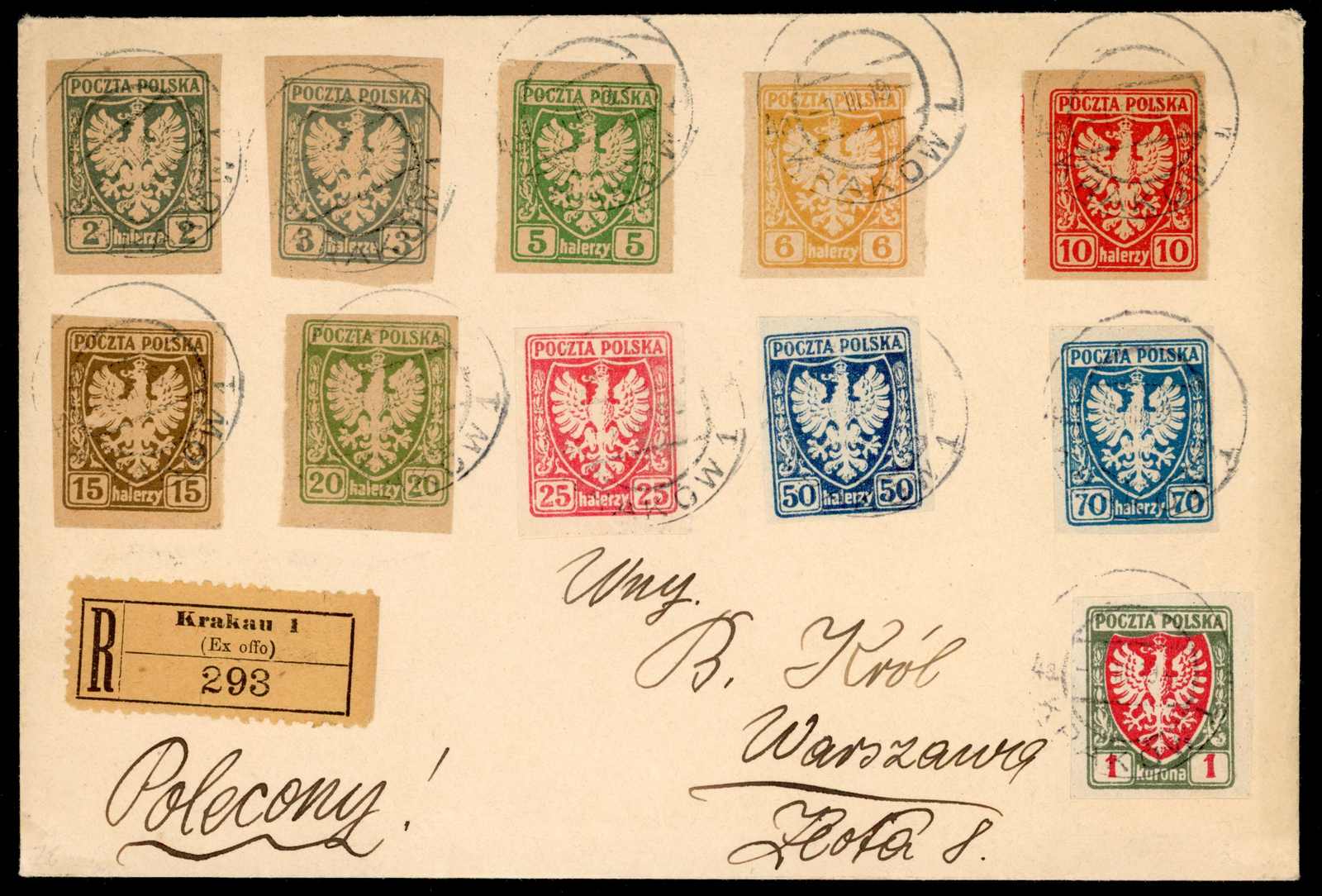 1919, 2 H. bis 1 Kr. Freimarken für Galizien, die kpl. Ausgabe von 11 Werten geschnitten, auf befördertem Satz-Einschreibbrief, aufgegeben "KRAKOW 1. III. 19", adressiert nach Warschau, rückseitig mit Ankunftsstp., saubere Qualität (ex.