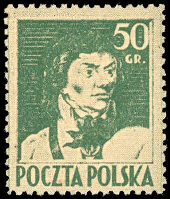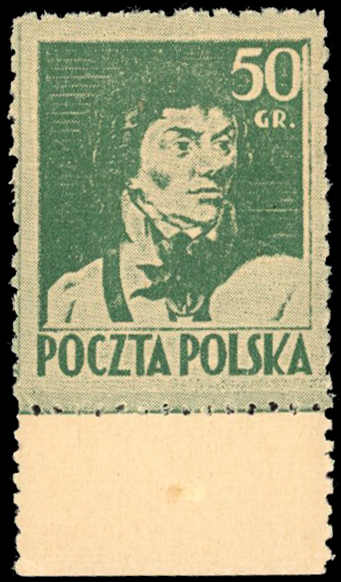 1945, 5 Zt. auf 50 Gr. General Kosciuszko dunkelgrün auf hellgrün, postfrischer Probedruck vom Unterrand, ohne roten Aufdruck, farbfrisch und gut gezähnt, einwandfrei, Fotoattest Petriuk (Fischer 200,- Zt) (Image) (imagea)