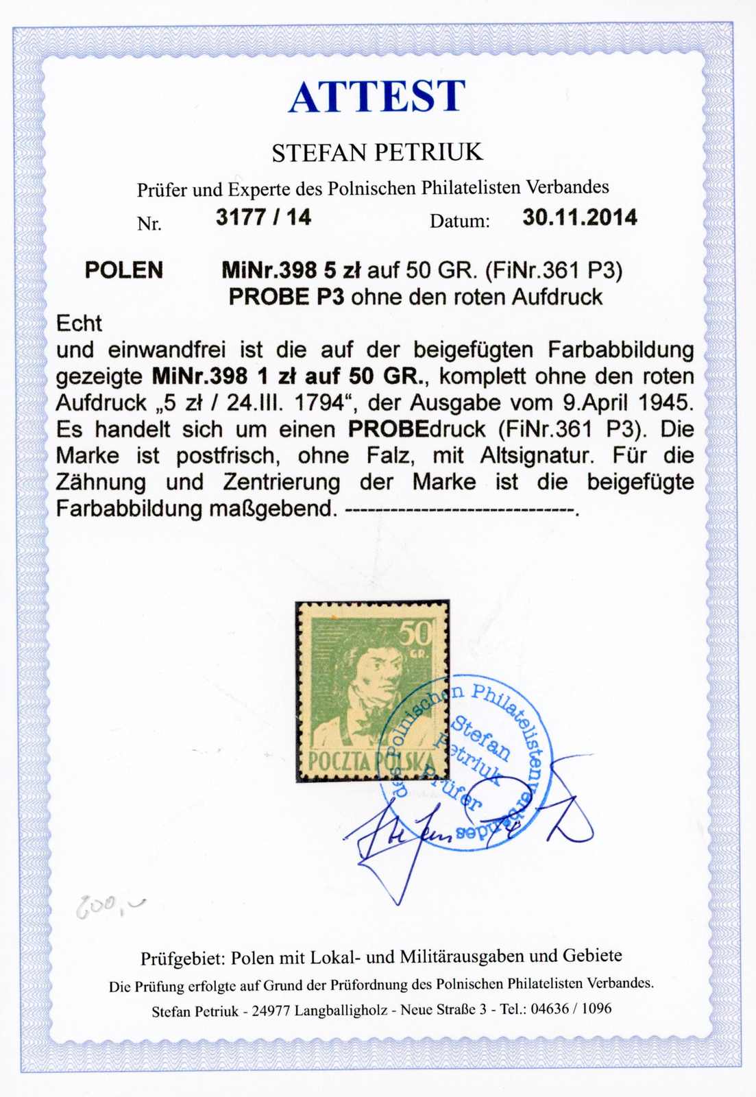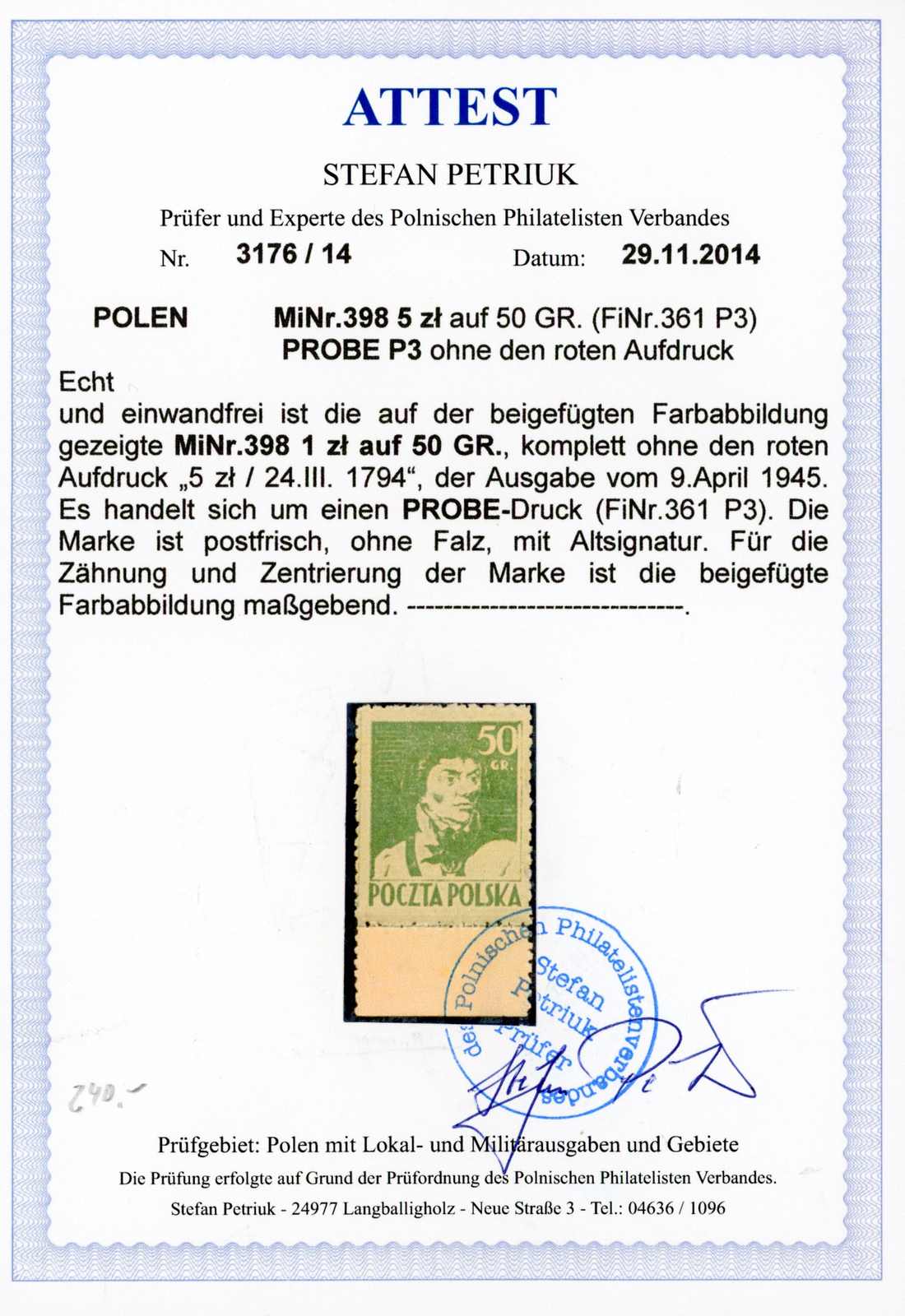 1945, 5 Zt. auf 50 Gr. General Kosciuszko dunkelgrün auf hellgrün, postfrischer Probedruck, ohne roten Aufdruck, farbfrisch und gut gezähnt, einwandfrei, signiert L. Schmutz und Fotoattest Petriuk (Fischer 200,- Zt) (Image) (imagea)