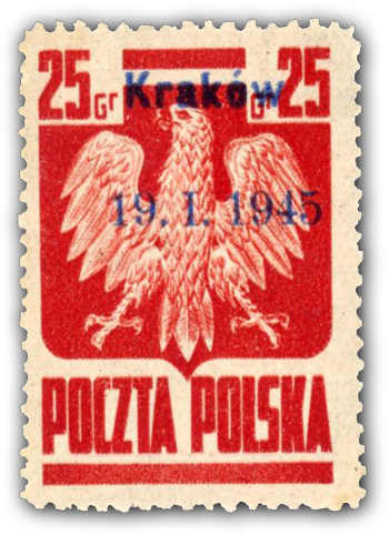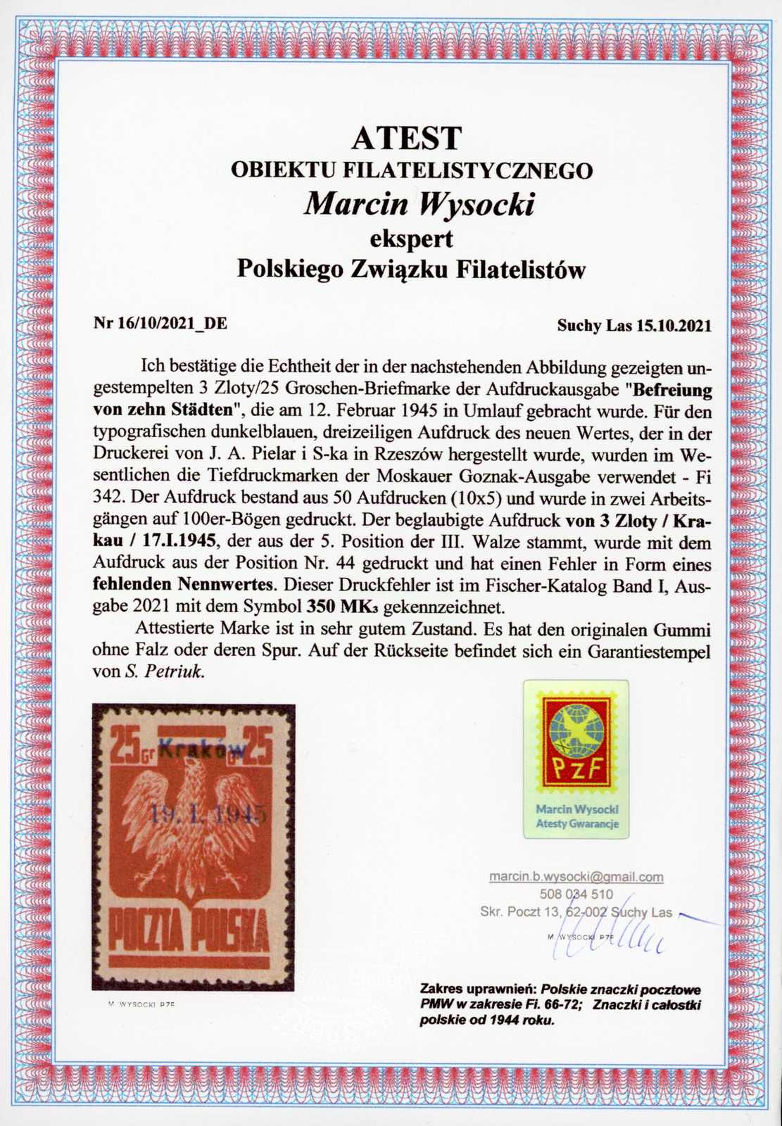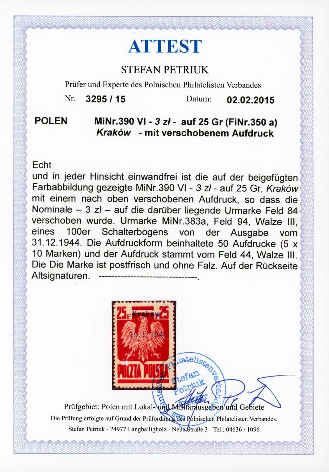 1945, 3 Zt. auf 25 Gr. Staatswappen karmin mit Aufdruck "Krakow" postfrisch mit nach oben verschobenem Aufdruck, dadurch ohne Nominalangabe, farbfrisch, einwandfrei, Fotoatteste M. Wysocki und Petriuk (Image) (imagea)