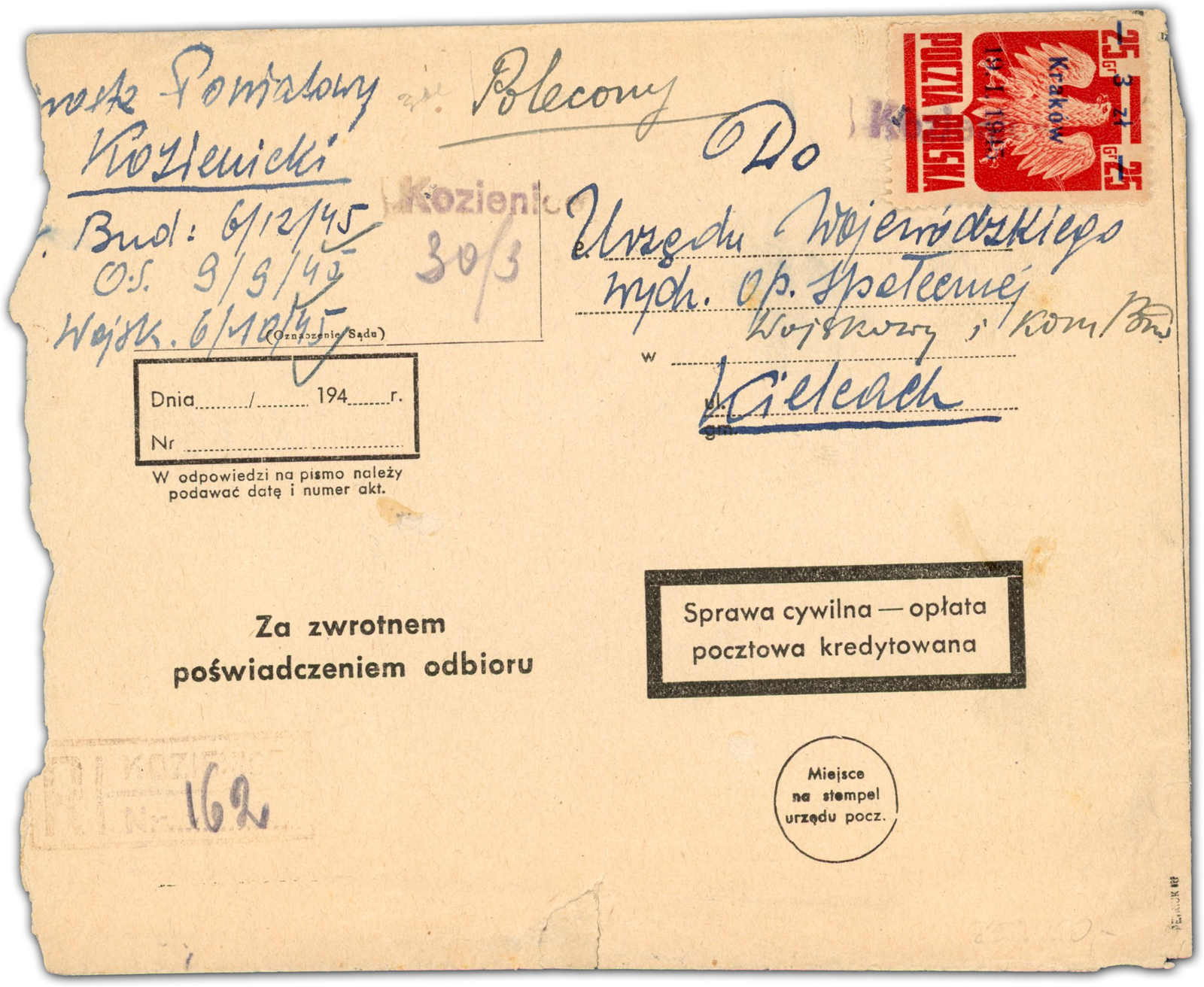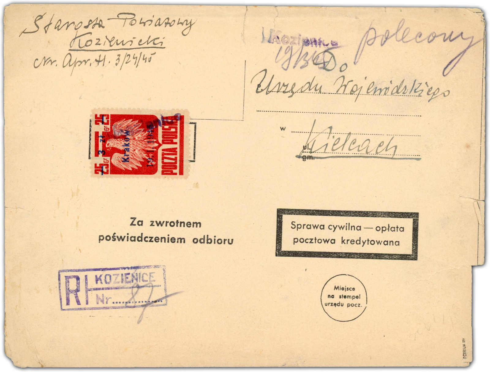 1945, 3 Zt. auf 25 Gr. Staatswappen mit Aufdruck "Krakau" als tarifgerechte Einzelfrankatur auf zwei R-Briefen mit Rückschein, die Rückscheingebühr musste der Empfänger zahlen, beide Briefe aufgegeben "KOZIENICE", aus 1945 adressiert nach