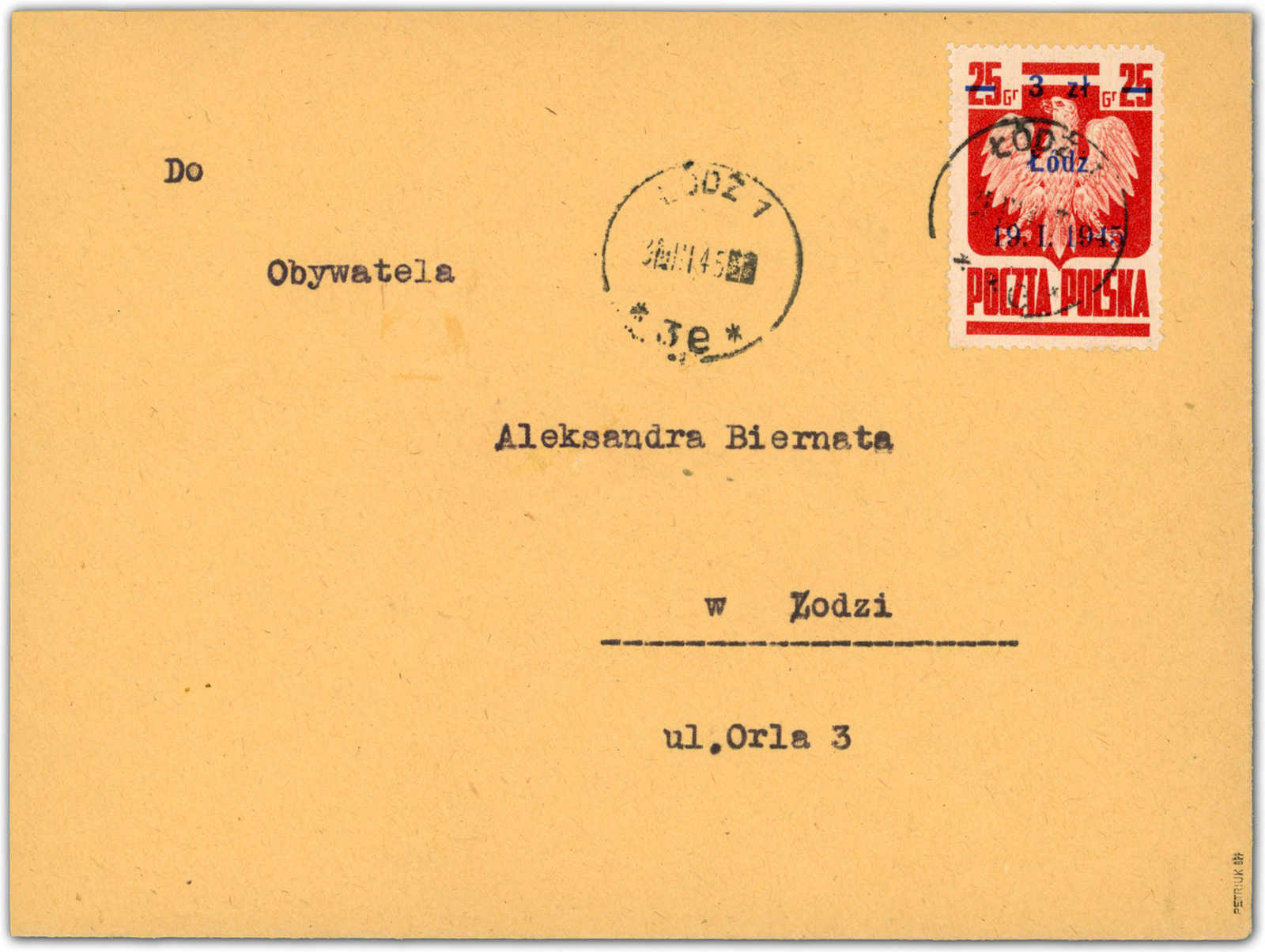 1945, 3 Zt. auf 25 Gr. Staatswappen karmin mit Aufdruck "Lodz" als tarifgerechte Einzelfrankatur auf Orts-Einschreiben, aufgegeben "LODZ 31.III.45", rückseitig mit Zensur, gute Qualität, geprüft Petriuk BPP (Image)