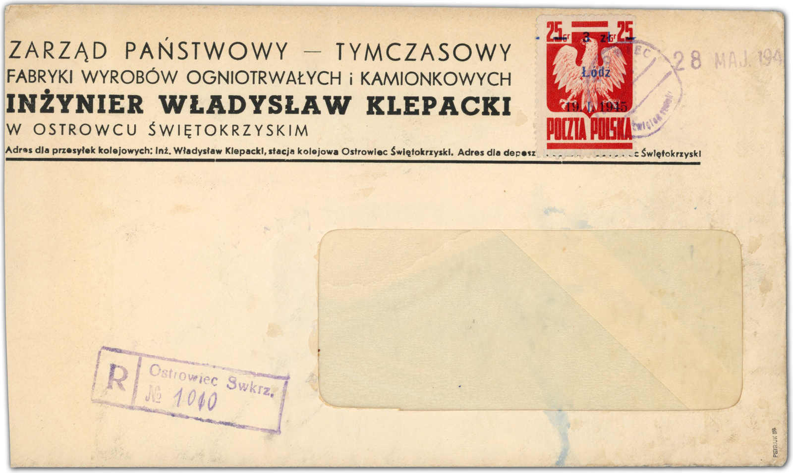 1945, 3 Zt. auf 25 Gr. Staatswappen karmin mit Aufdruck "Lodz" als tarifgerechte Einzelfrankatur auf Einschreibbrief, aufgegeben "OSTROWIEC" mit nebengesetztem Datumsstempel "28 MAJ 194(5)", beide Stempel in Violett, wahrscheinlich