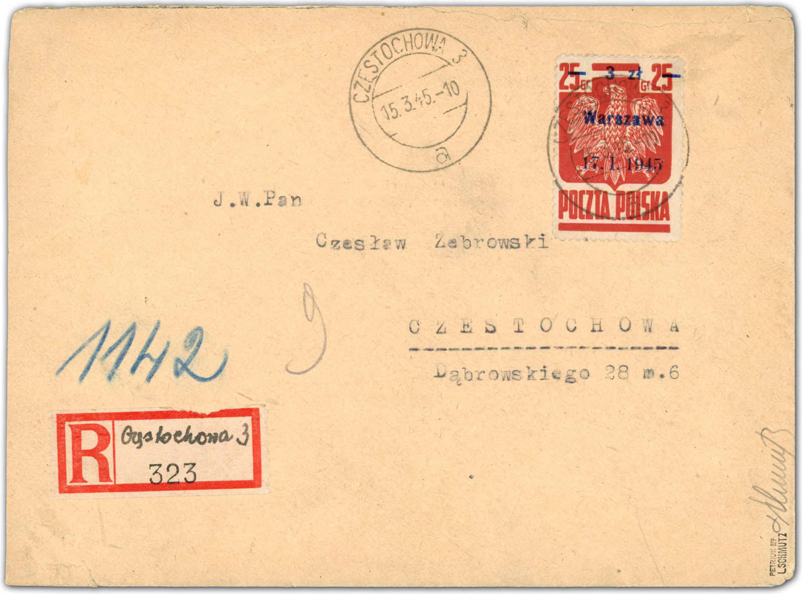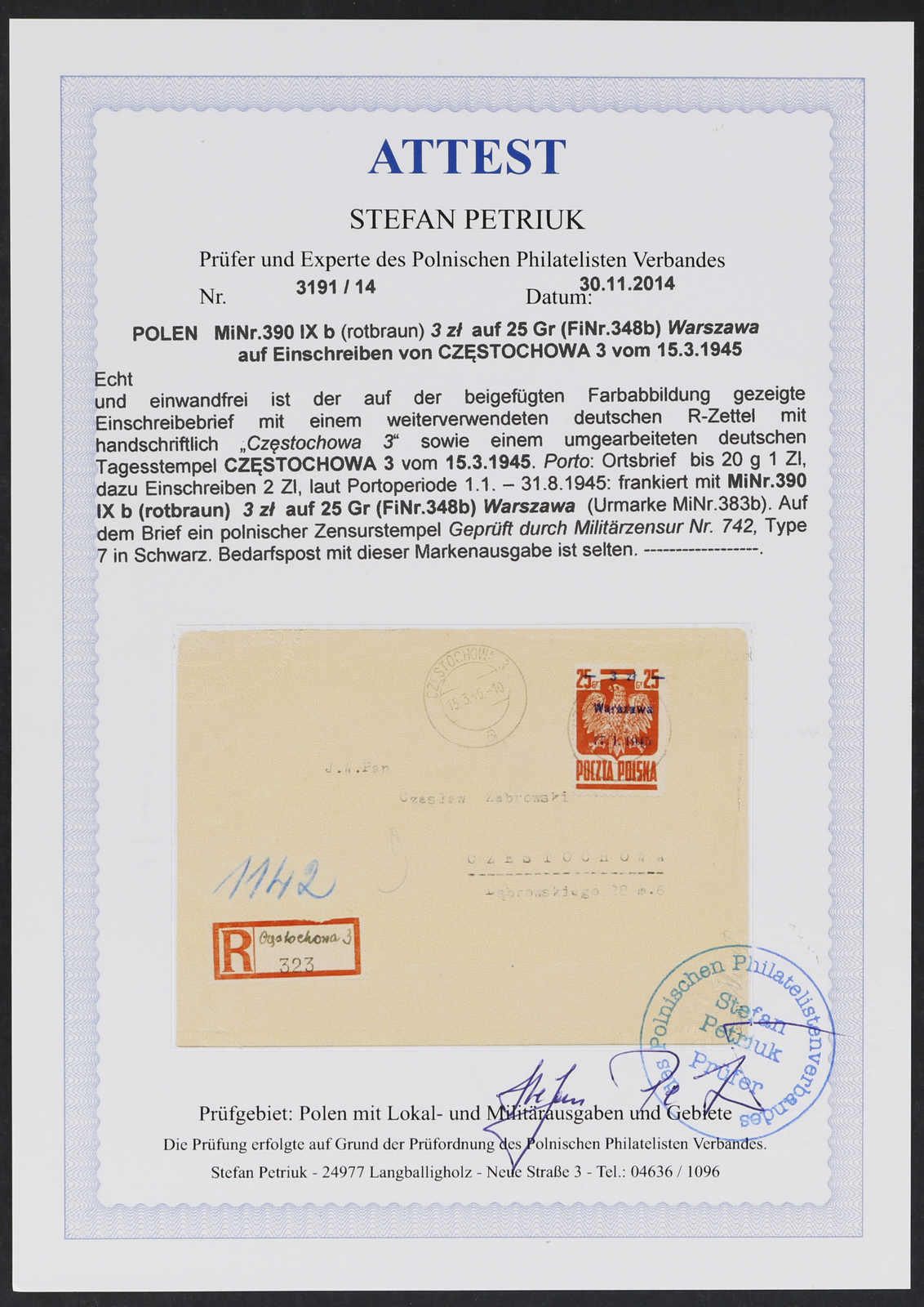 1945, 3 Zt. auf 25 Gr. Staatswappen rotbraun mit Aufdruck "Warszawa" auf tarifgerechtem Einschreibbrief im Ortsverkehr, aufgegeben "CZESTOCHOWA15.3.45", rückseitig Zensur, ein sehr seltener Brief, Umschlag mit eingerissener Ecke links