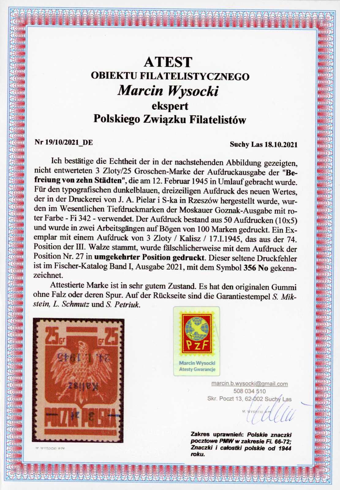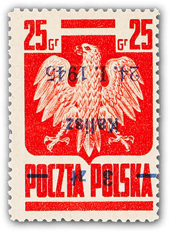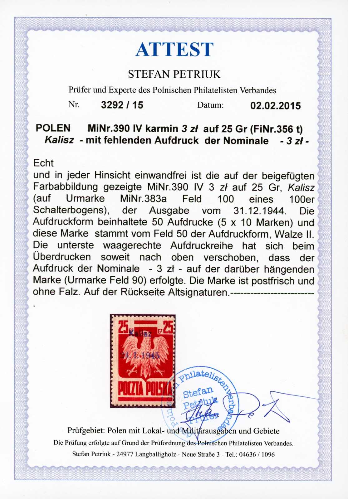 1945. 3 Zt. auf 25 Gr. Staatswappen karmin mit Aufdruck "Kalisz" postfrisch ohne Nominalwert (verschobener Aufdruck), farbfrisch und gut gezähnt, interessante Variante, einwandfrei, Fotoattest Petriuk (Image) (imagea)