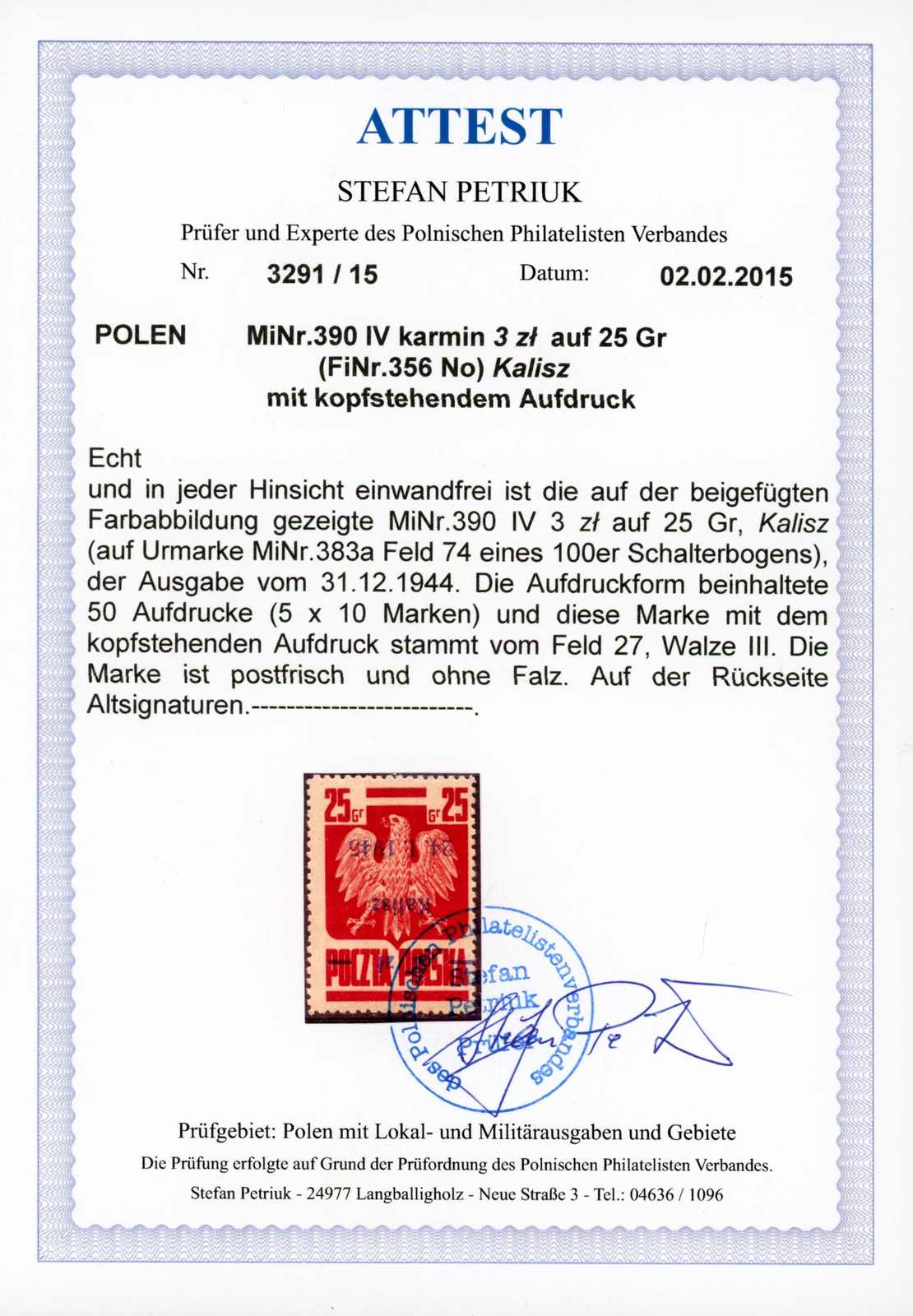 1945. 3 Zt. auf 25 Gr. Staatswappen karmin mit kopfstehendem Aufdruck "Kalisz" postfrisch, farbfrisch und gut gezähnt, selten angeboten, einwandfrei, signiert L. Schmutz, Fotoatteste Petriuk und M. Wysocki (Image) (imagea)
