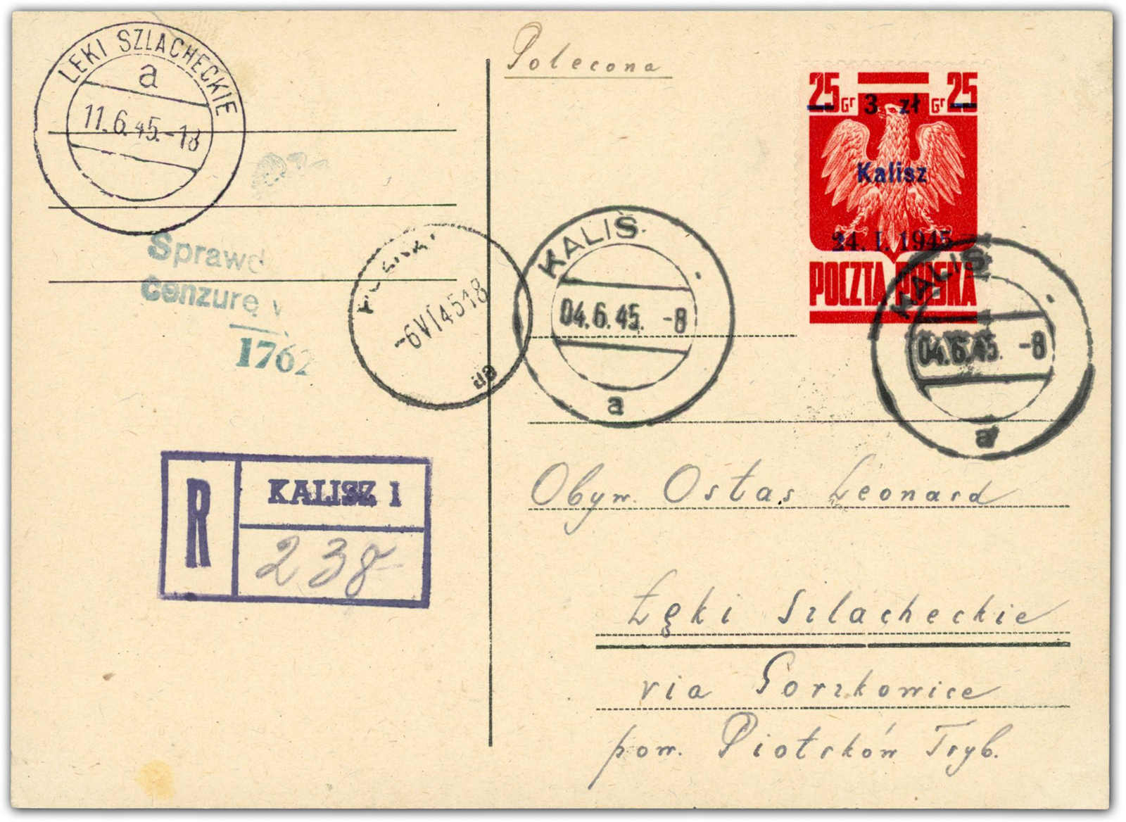 1945. 3 Zt. auf 25 Gr. Staatswappen karmin mit Aufdruck "Kalisz" als portogerechte Einzelfrankatur auf Einschreibkarte, aufgegeben "KALISZ 04.6.45", adressiert nach "LEKI SZLACHECKIE", vorderseitig Ankunftsstempel und Zensur, rückseitig
