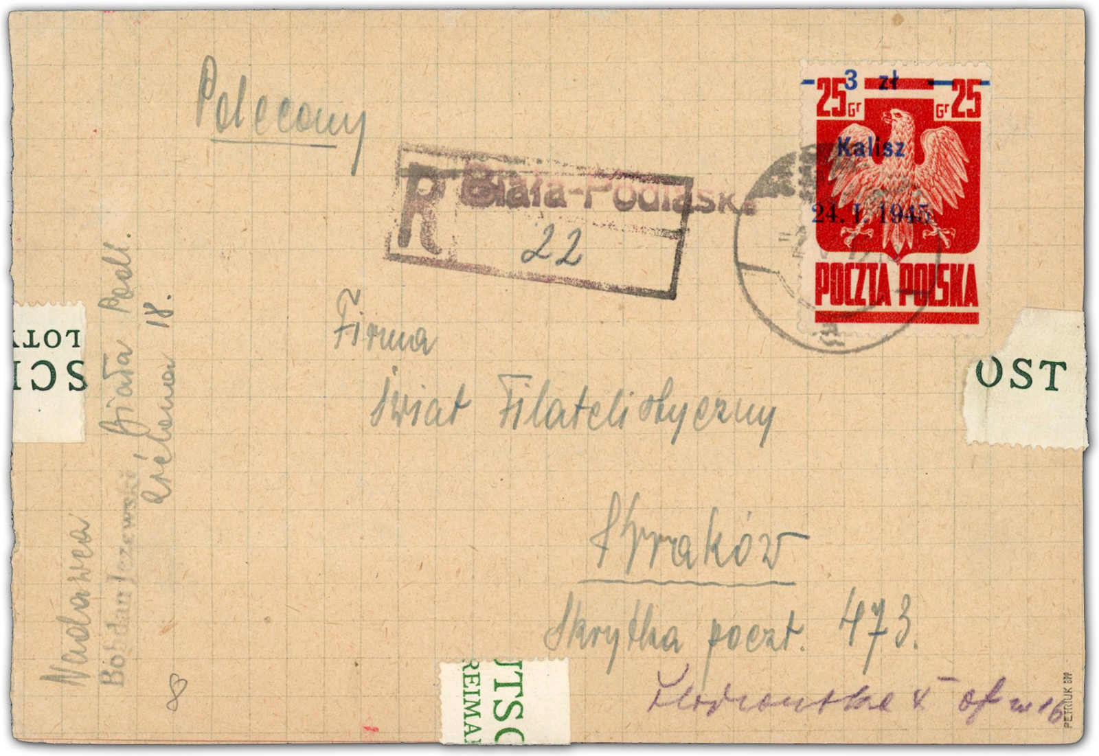1945, 3 Zt. auf 25 Gr. Staatswappen karmin mit Aufdruck "Kalisz" als portogerechte Einzelfrankatur auf Einschreiben, aufgegeben "Biala Podlaska", mit aptiertem Stempel vom 2.5.45 entwertet, adressiert nach Krakow, rückseitig Zensur und