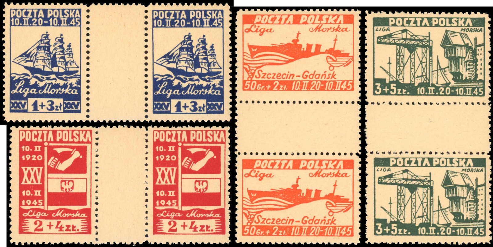 1945, 50 Gr. + 2 Zt. bis 3 Zt. + 5 Zt. Liga Morska (Meeres-Liga), vier postfrische Paare mit Zwischensteg, farbfrisch und gut gezähnt, einwandfrei, Fotoattest Petriuk BPP (ME 350,-) (Image) (imagea)