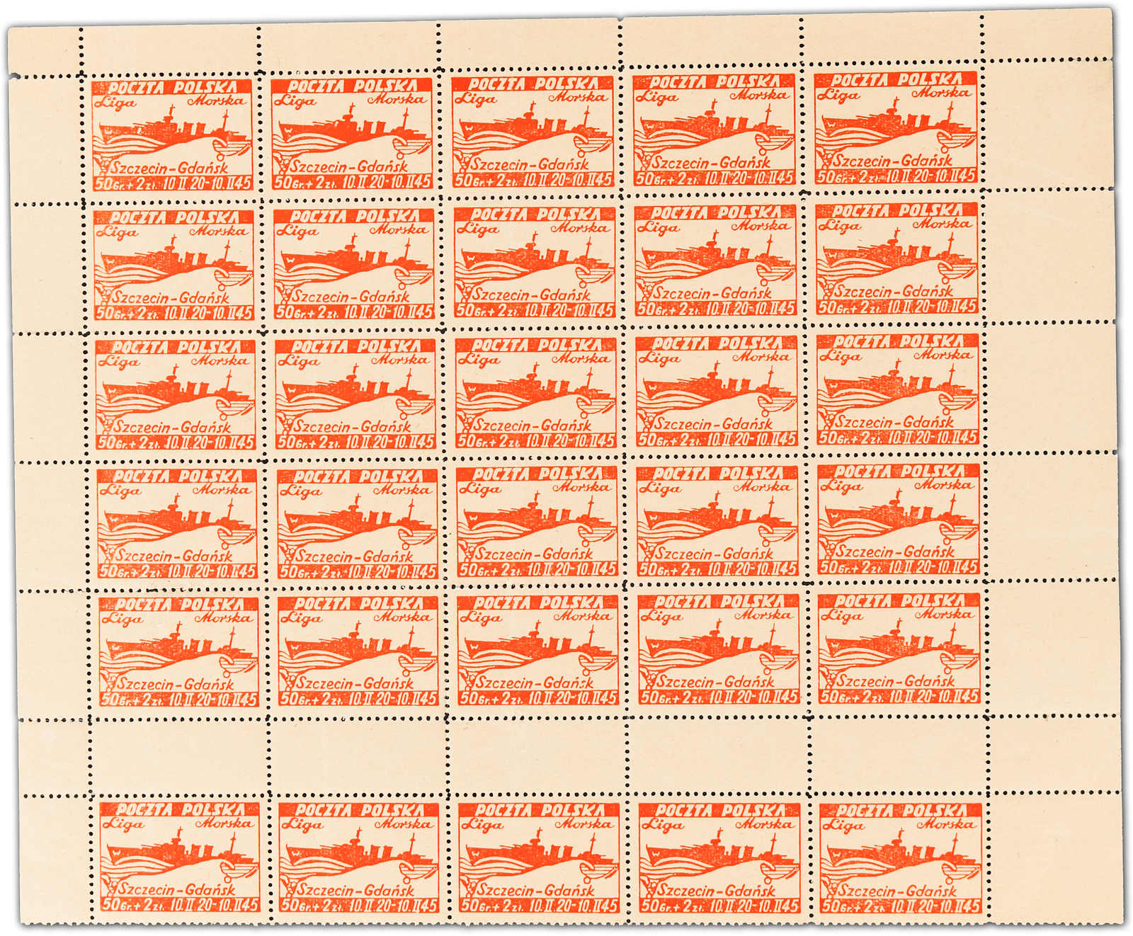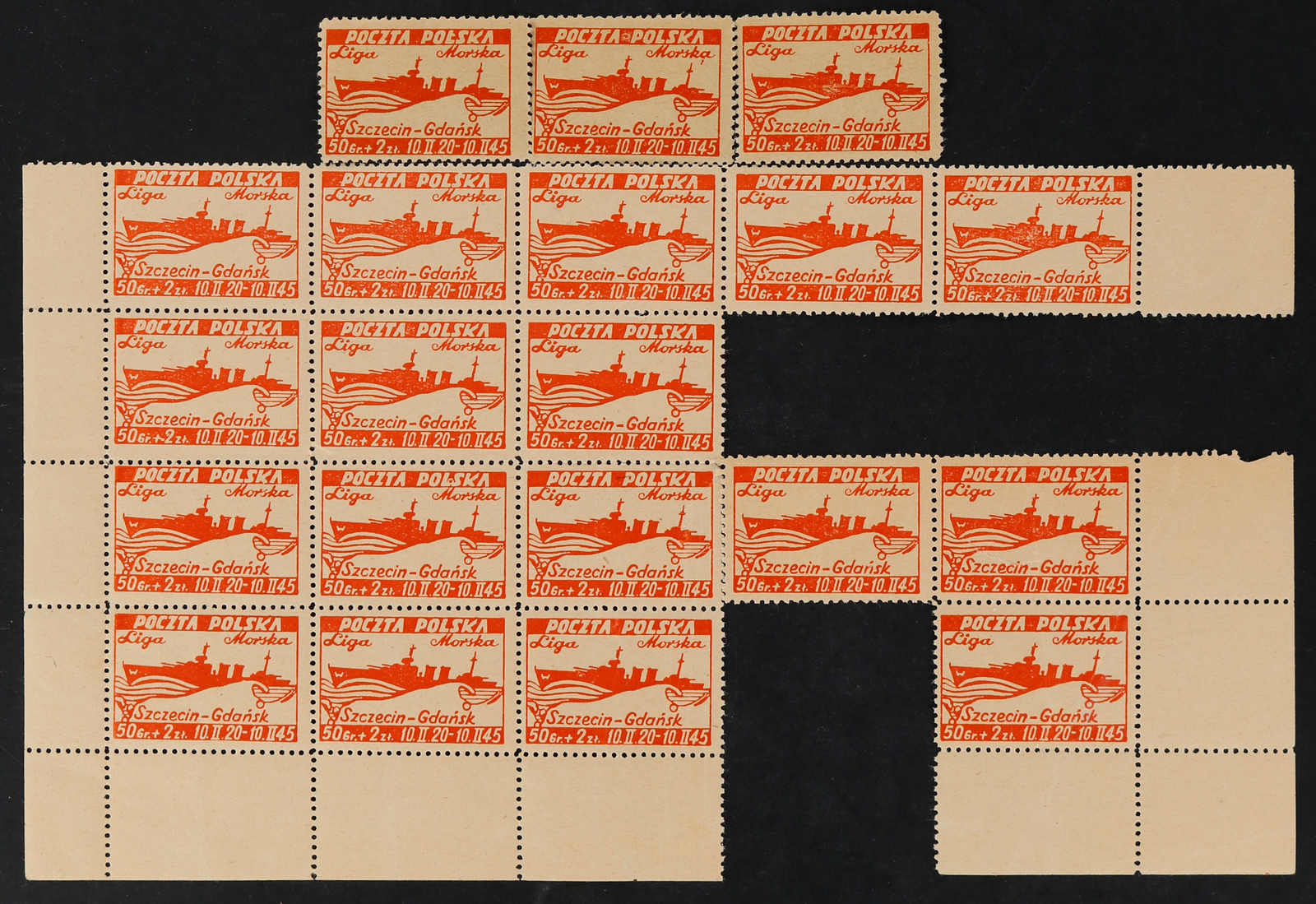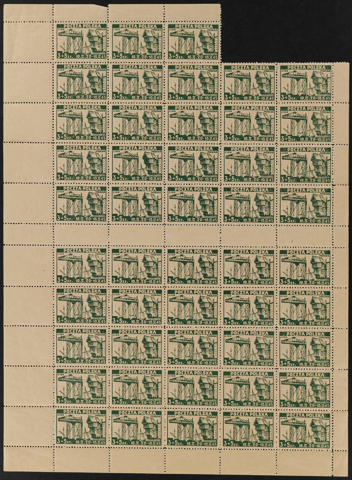 1945, 50 Gr. + 2 Zt. bis 3 Zt. + 5 Zt. Liga Morska (Meeres-Liga), die komplette Ausgabe von 4 postfrischen Werten im ungetrennten Druckbogen (2 Schalterbögen) mit je 5 Zwischenstegpaaren, dabei die Bogen zu 50 Gr.+ 2 Zt. und 1 Zt. + 3 Zt.
