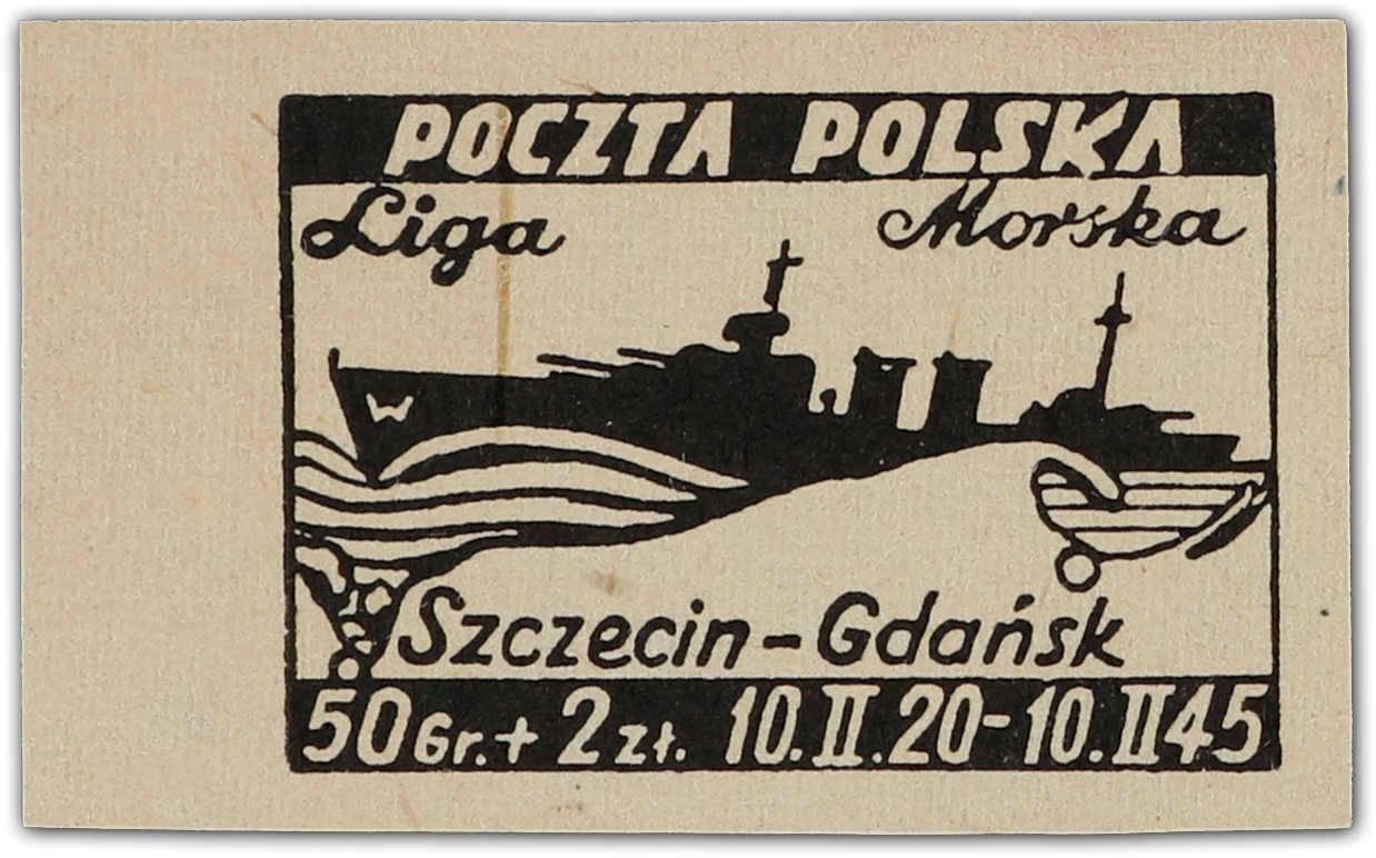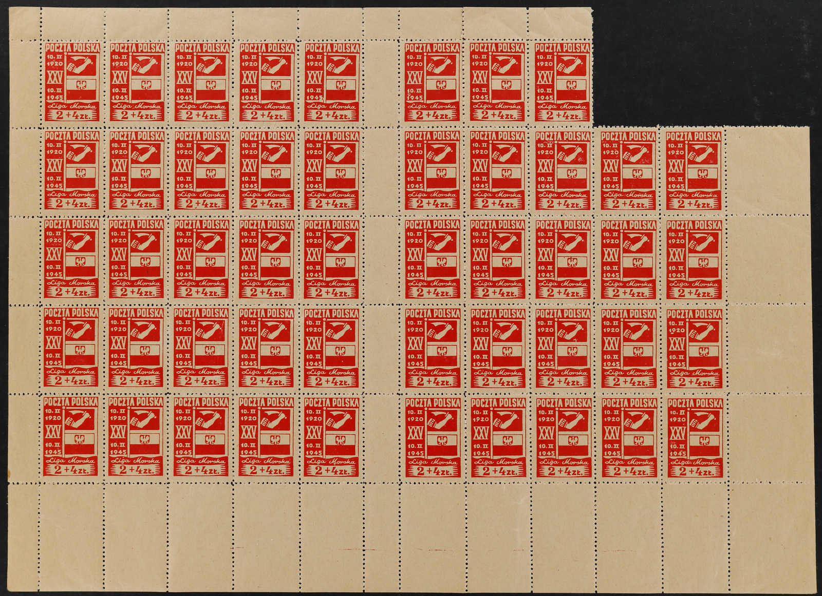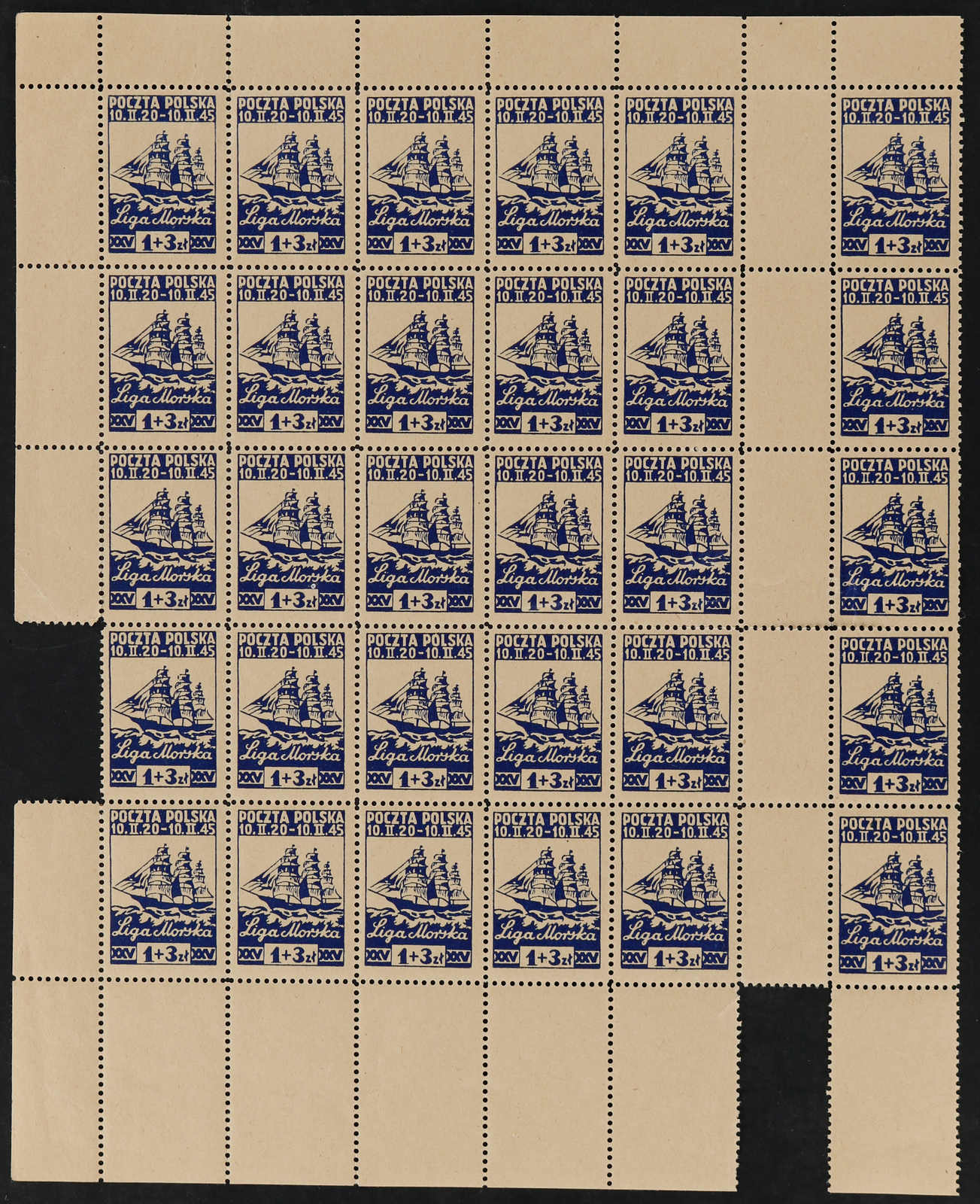 1945, 50 Gr. + 2 Zt. bis 3 Zt. + 5 Zt. Liga Morska (Meeres-Liga), die komplette Ausgabe von 4 postfrischen Werten im ungetrennten Druckbogen (2 Schalterbögen) mit je 5 Zwischenstegpaaren, dabei die Bogen zu 50 Gr.+ 2 Zt. und 1 Zt. + 3 Zt.