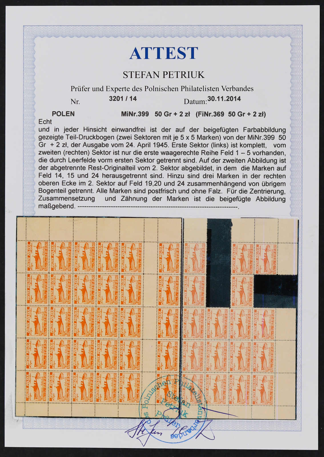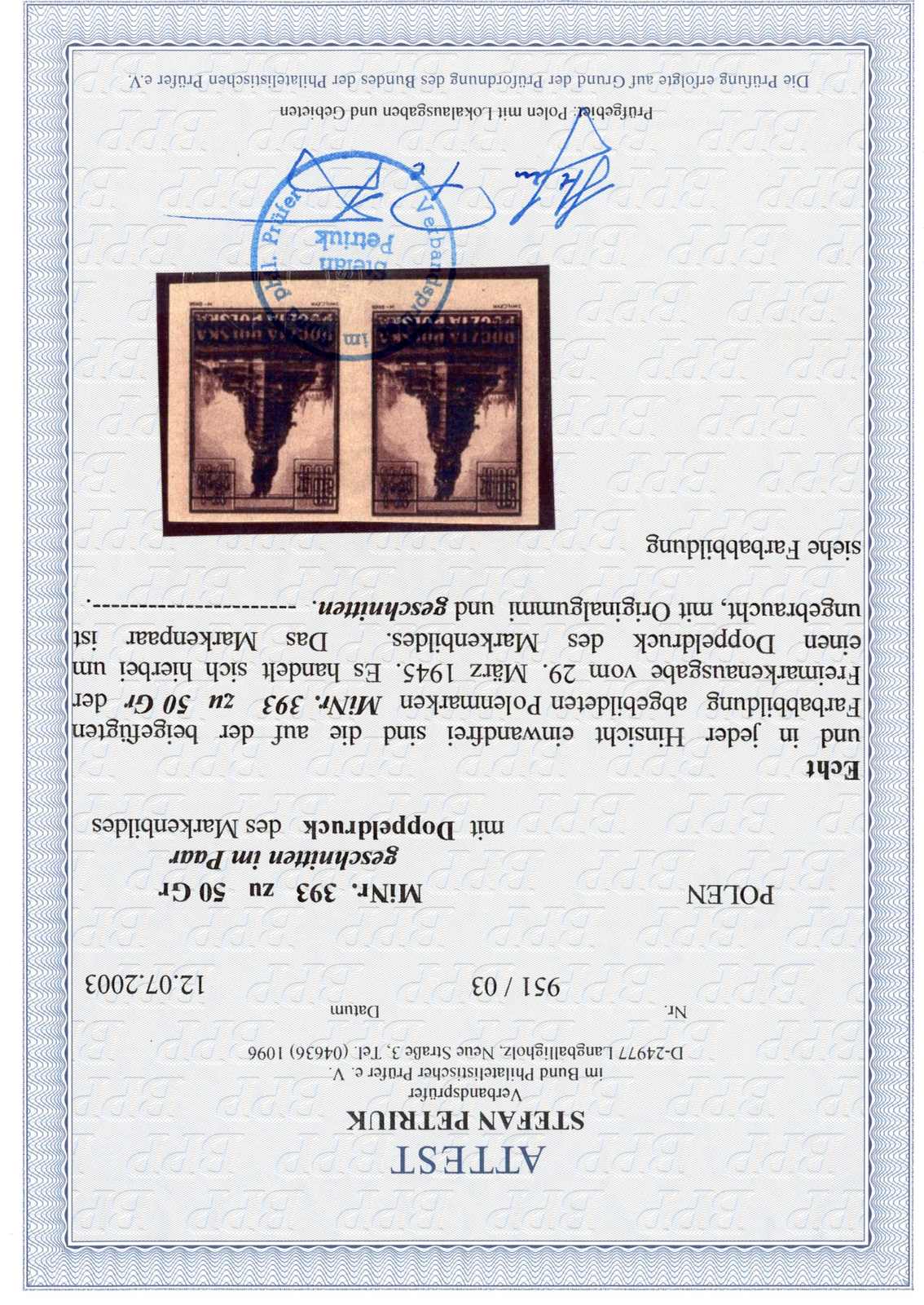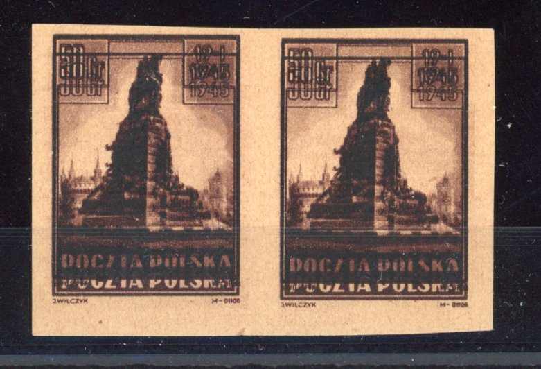 1945, 50 Gr. Befreiung von Krakau, ungebrauchtes waagerechtes Paar im Doppeldruck, ungezähnt, farbfrisch und breitrandig, einwandfrei, Fotoattest Petriuk BPP (Image) (imagea)