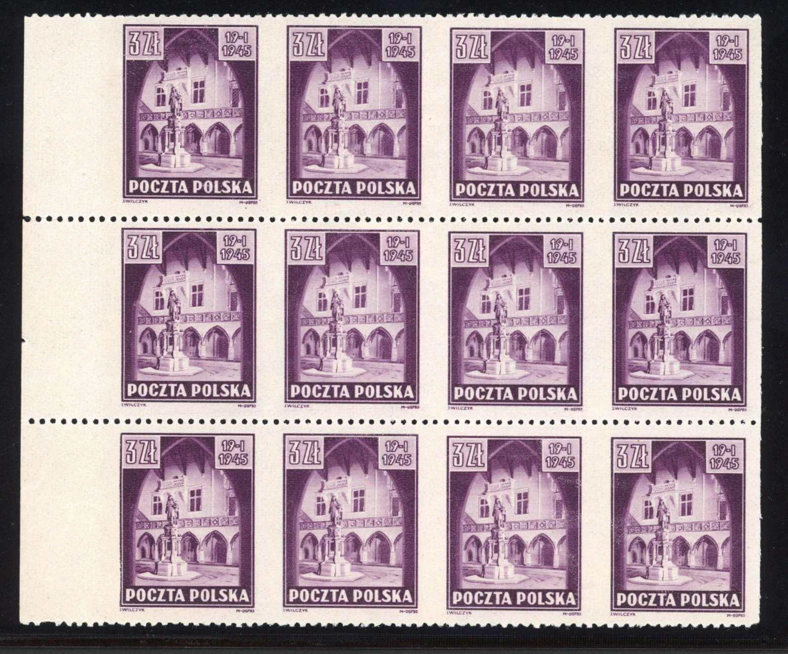1945, 3 Zt. Befreiung von Krakau, ungebrauchter 12er-Block vom linken Bogenrand, senkrecht ungezähnt, rückseitig ohne Gummierung, farbfrisch und gut gezähnt, in den waager. Reihen vorgefaltet, sonst einwandfrei (Image)