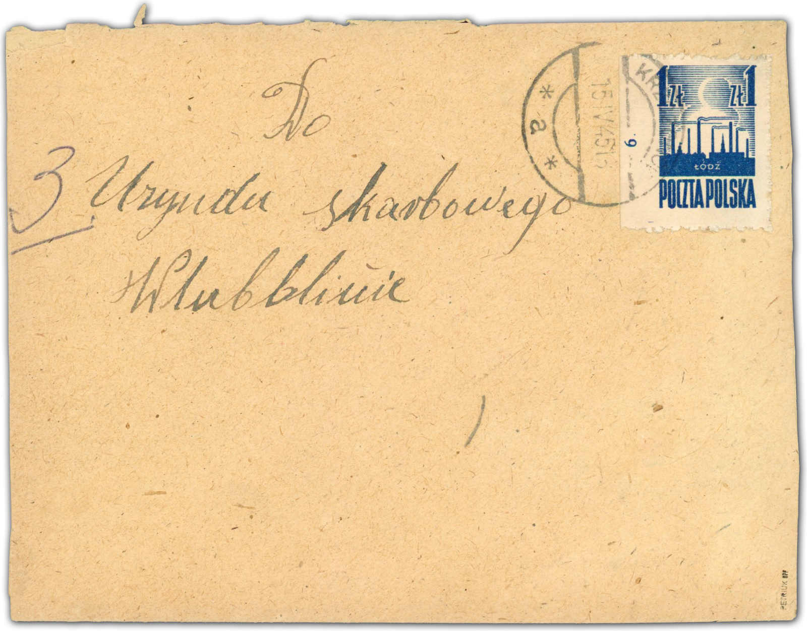 1945, 1 Zt. Befreiung von Lodz und Warschau dunkelblau, links ungezähnt, als portogerechte Einzelfrankatur, aufgegeben "KRZCZONOW *a* 15.4.45", adressiert an das Finanzamt, rückseitig mit Zensur, einwandfrei, geprüft Petriuk BPP, (Image)