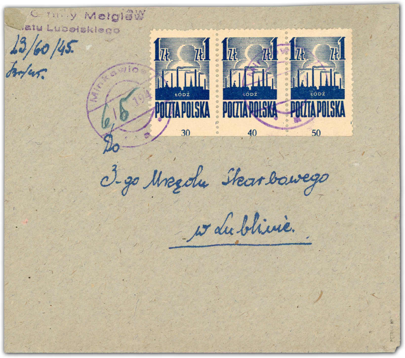 1945, 1 Zt. Befreiung von Lodz und Warschau dunkelblau, unten ungezähnt, im waagerechten 3er-Streifen auf überschwerem Inlandsbrief, aufgegeben "Minkowice a 6.5.45", entwertet mit provisorischem Stempel in Violett und handschriftlich