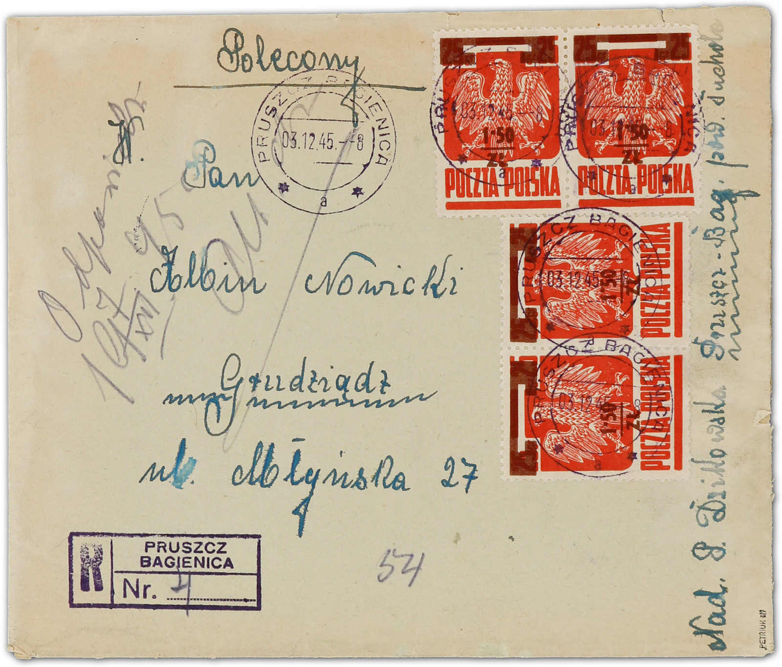 1945, 1,50 Zt. auf 25 Gr. Staatswappen rotbraun, zwei waagerechte Paare, je im Typenpaar mit den Aufdrucken in Type 1 und Type 2, als portogerechte MeF auf Einschreibbrief, aufgegeben "PRUSZCZ BAGIENICA 03.12.45", adressiert nach