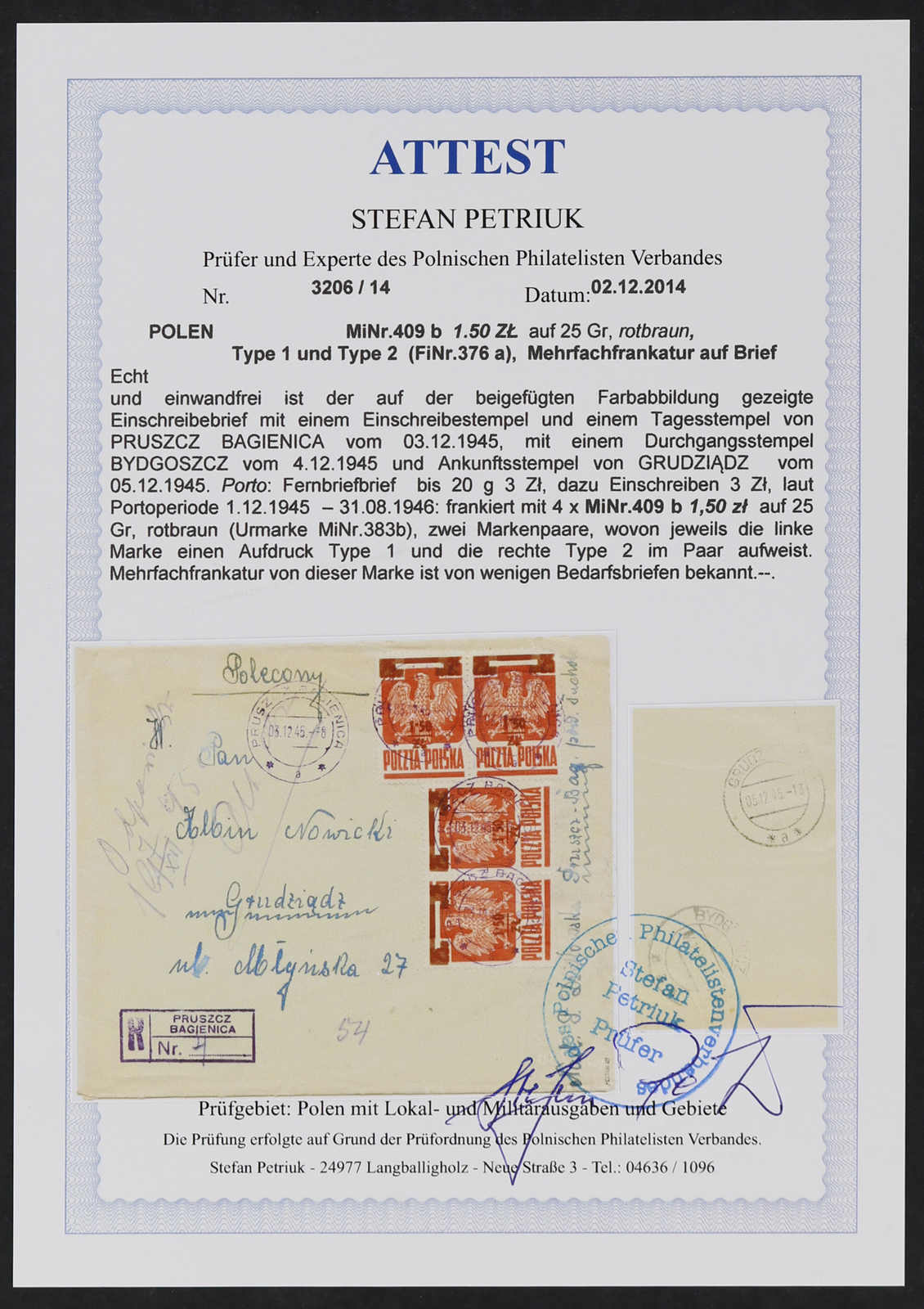 Grudziadz, rückseitig mit Zustellungsvermerk vom 7. XII. 45, eine seltene Frankatur, Brief mit leichten Beförderungsspuren, einwandfrei, signiert und Fotoattest Petriuk (Image) (imagea)