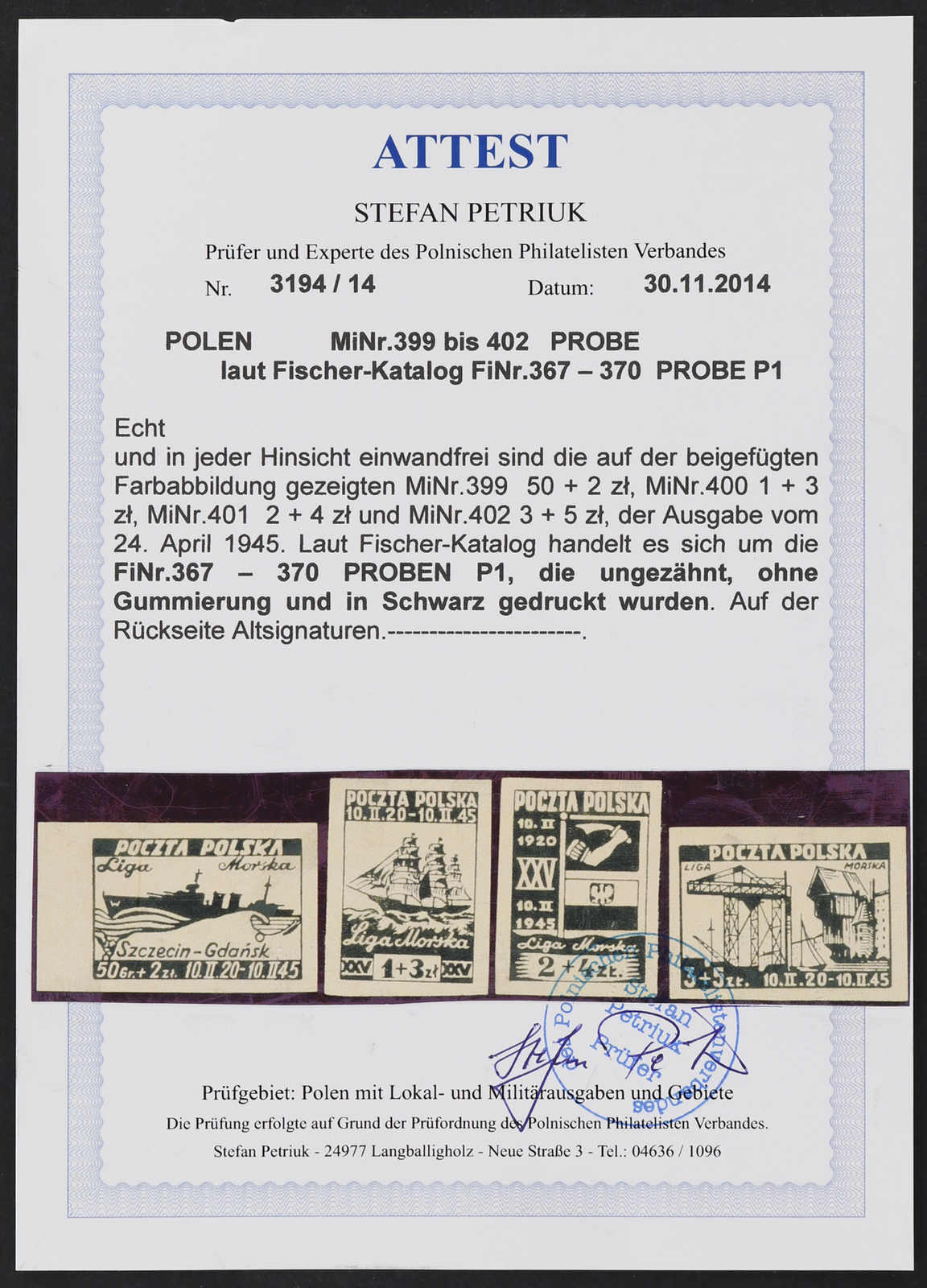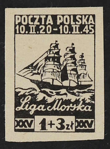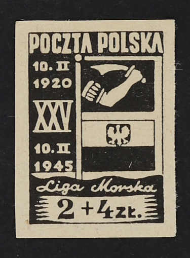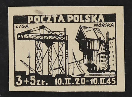 1945, 50 Gr.+2 Zt. bis 3 Zt.+5 Zt. Liga Morska, die komplette Ausgabe von 4 Werten als ungezähnte Probedrucke auf weißem ungummierten Papier in Schwarz, farbfrisch und breitrandig, der Wert zu 3 Zt.+5 Zt. mit kleinem Papiereinschluss