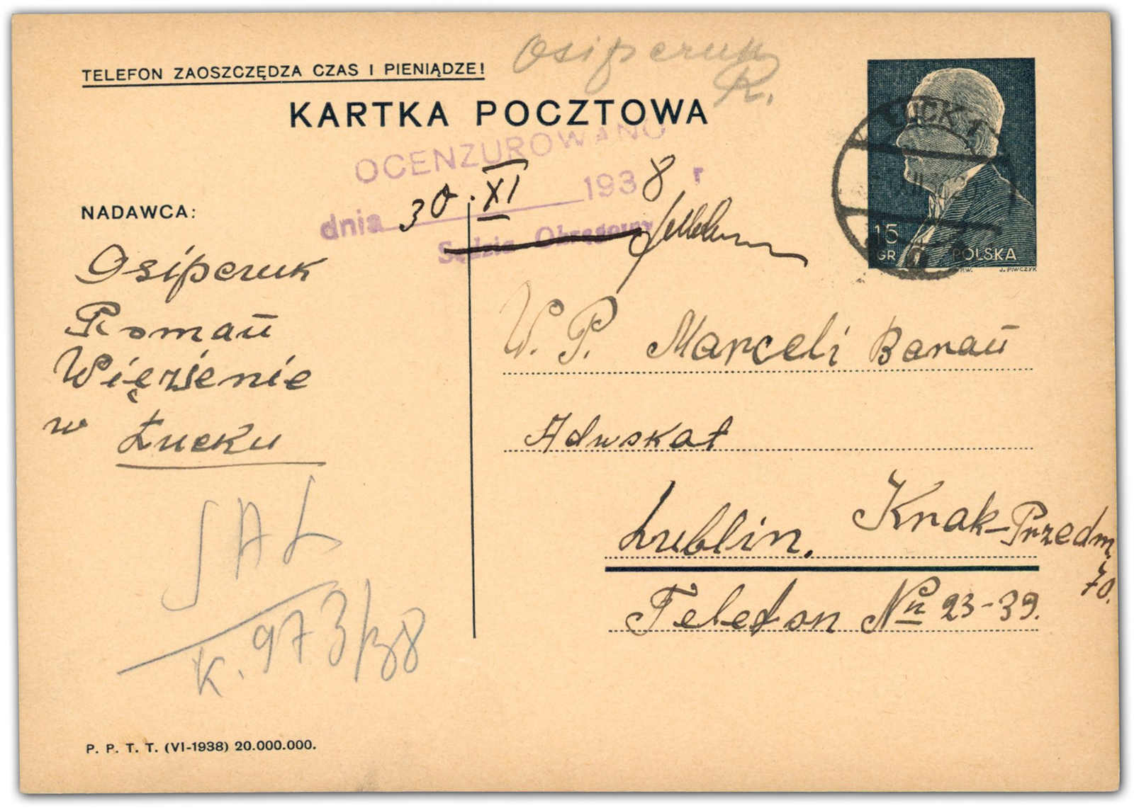 1938, 15 Gr. Ganzsachenkarte, portogerechte Verwendung als Inlandspostkarte eines Gefängnisinsassen an einen Rechtsanwalt, aufgegeben "LUCK 1 ...IX.38", adressiert nach Lublin, vorderseitig mit Ausgangszensur, rückseitig viel Bedarfstext,
